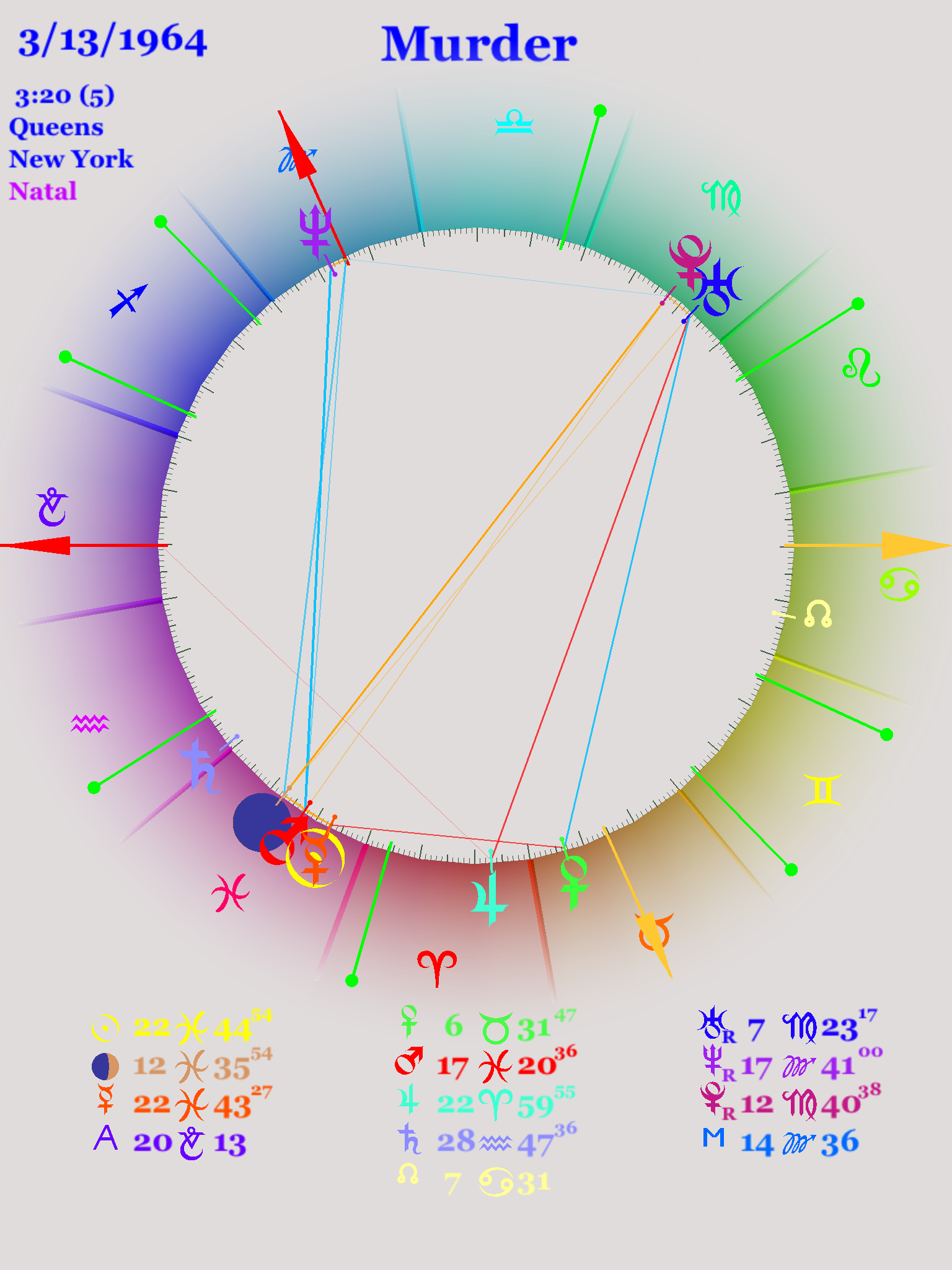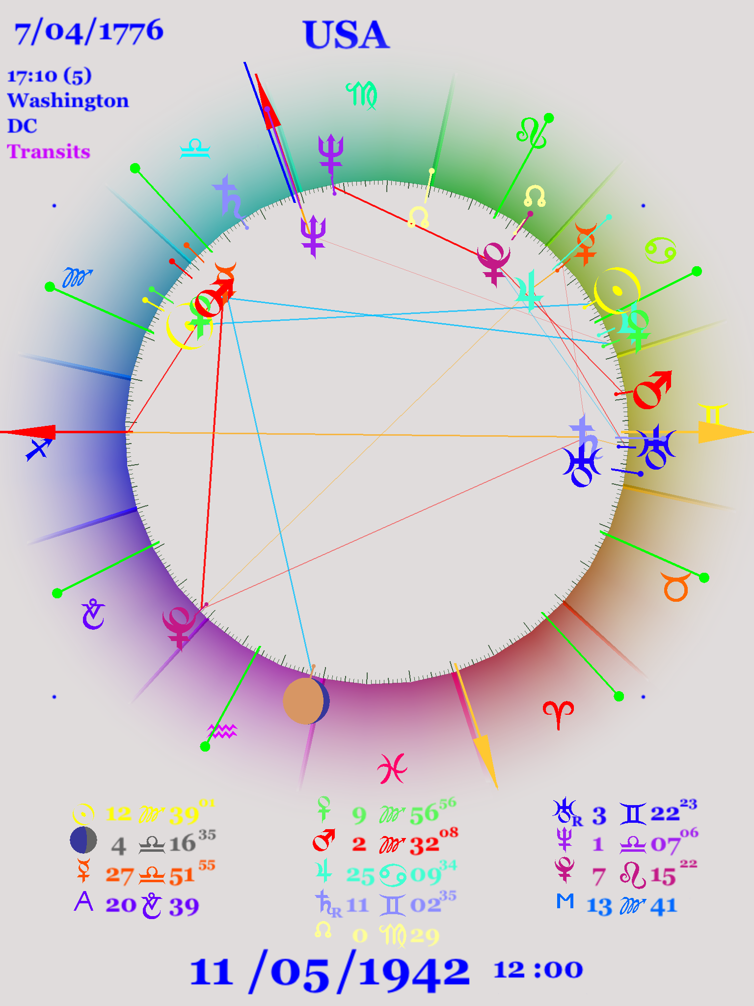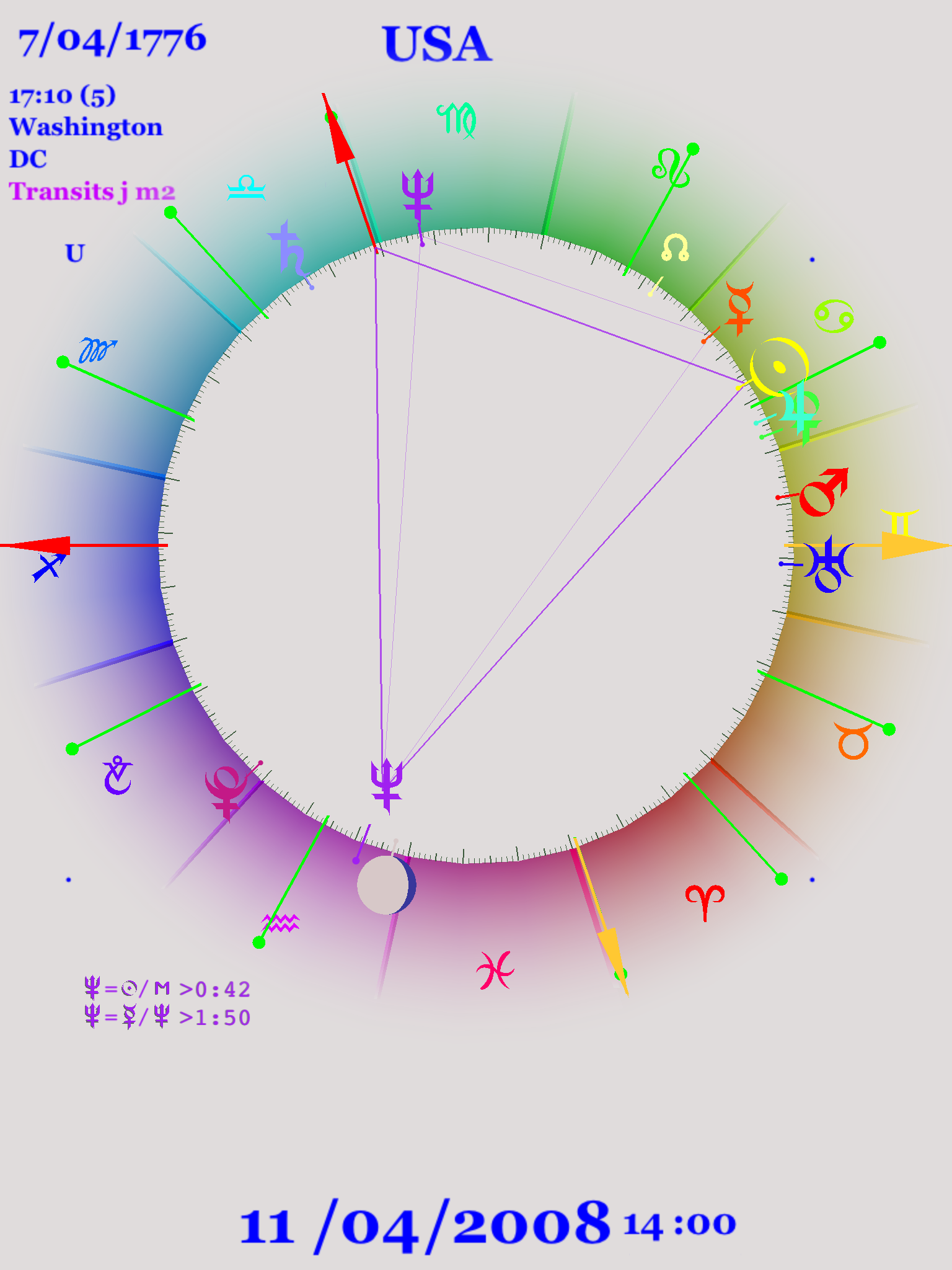 In part I we looked at the three wars that divide American history into convenient and appropriate sections: The Revolutionary War, the Civil War, and World War II, and found that these three wars came at intervals of about 84 years, one Uranus cycle. In each case, at some point Uranus was opposite the Ascendant, and thus conjunct the Descendant, of the United States chart. Also during the war, Neptune was either conjunct or opposite the Midheaven of the United States. This may or may not be because Neptune has almost exactly double the period of Uranus and so when Uranus moves around the zodiac once Neptune moves half-way around the zodiac.