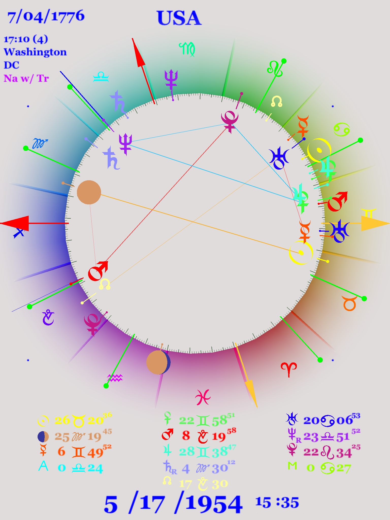 Once you understand the chart of the United States, you will begin to see how the meanings of the planets play out in history and in everyday life. The symbols of the planets cease to be abstractions but rather can be seen all around you. The daily headlines reflect the astrology of the United States: you only need to open your eyes to see astrology at play all the time. We are fortunate that the birth date of the United States is recent, and well established. Everyone who has participated in that summer birthday celebration knows when the country was born.