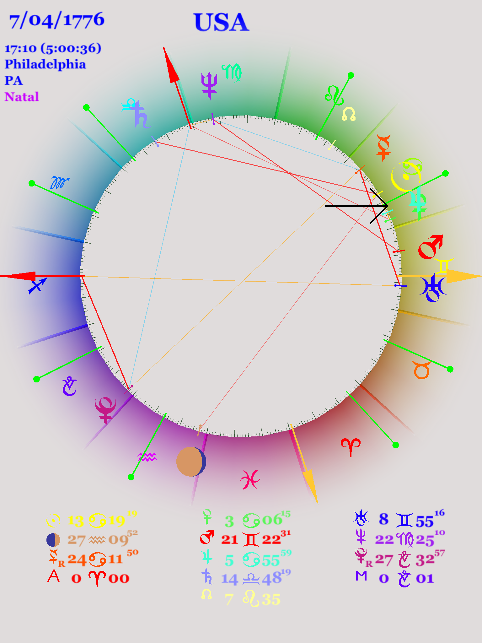 The triple conjunction of Venus, Jupiter, and the Sun in the natal chart of the United States describes many fundamental features of the national character of the United States.   Ever since its founding, the country that was to become the United States displayed strongly Venus and Jupiter characteristics; at the beginning Venus and Jupiter manifested themselves in different ways than when America was a well-established country. This triple conjunction was extremely beneficial to the United States and its reputation around the world.  Currently, as America and the American lifestyle become attractive around the world, the Venus-Jupiter characteristics are appearing outside the United States as well  — the world  is becoming Americanized.  This virtuous country, that had its birth in 1776, has, partly because of the appreciation of this virtue, become the model for many other countries who try to emulate the United States.