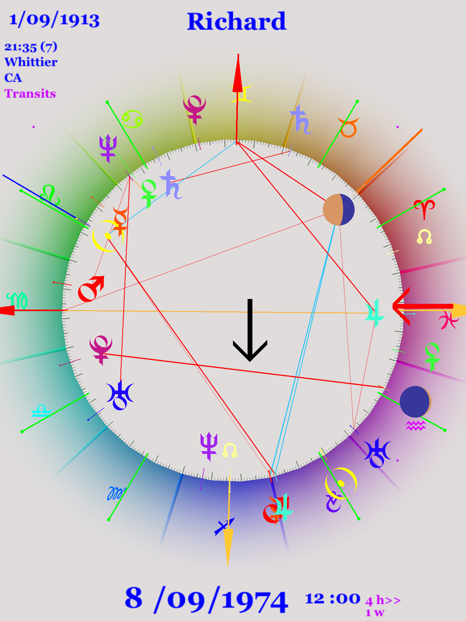 It is only fair to also look at the chart of the man in question, Richard Nixon. Nothing spectacular here. Jupiter had been hanging out – it had gone retrograde – opposite his Ascendant and square his Midheaven (red arrow) for the last two and a half months, and after the resignation Jupiter had rapidly sped away from any connection to the two angles. I’m sure Richard Nixon felt a lot of relief after this whole ordeal was over, that the resignation was a relief. Pluto is a very important planet in Nixon’s chart, up near the Midheaven natally and opposite his Mercury-Mars-Jupiter conjunction, that attests to his skill as a lawyer and his paranoia. At the time of the resignation transiting Pluto is closely sesquiquadrate (14 minutes – black arrow) to his natal moon. Because Pluto had been retrograde and went direct on (sesquiquadrate) his Moon, this aspect had lasted for over four months and was almost exact on the day of his resignation.