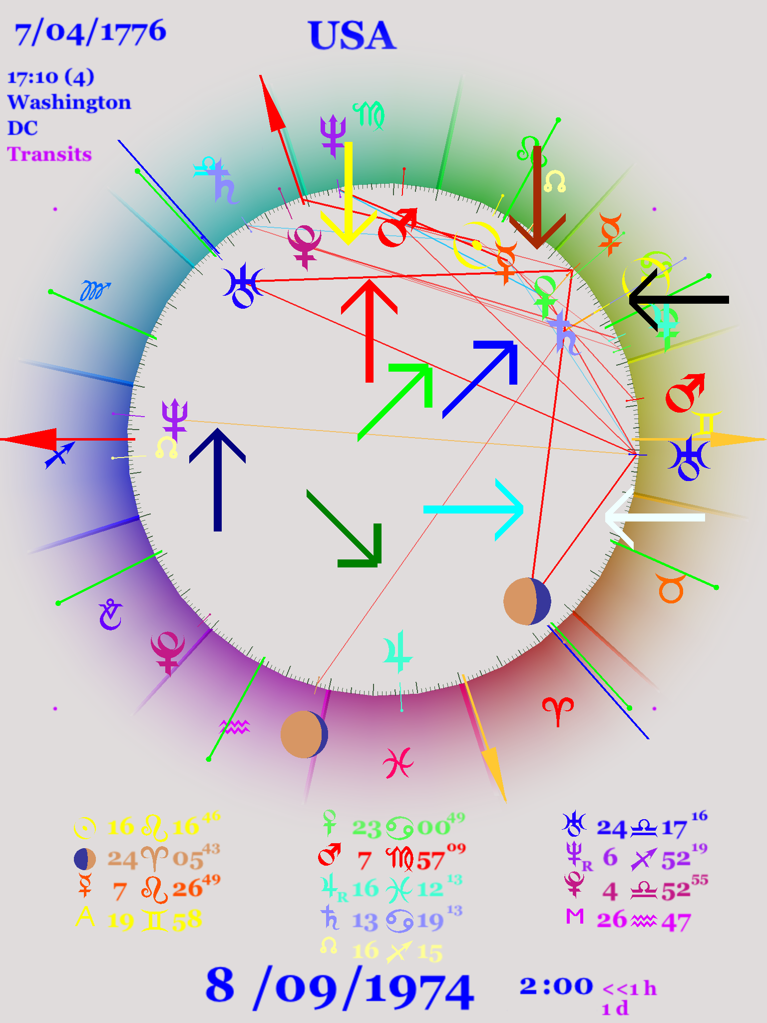 Finally, the Moon of the United States, representing the People as opposed to the Government, is receiving sesquiquadrate from Saturn (olive arrow) indicating that the people are being stressed by this scandal. In fact, Americans were rooted to their television sets during what was called “Watergate Summer” (Summer of 1973) when the Congressional Hearings about Watergate were taking place. Interestingly, it was an event that helped bring Americans together. There were many repercussions from the whole Watergate imbroglio, such as the Church Hearings starting the next year which investigated the activities of the CIA, NSA, and FBI. Back in those days the Congress was much more daring than the current Congress.