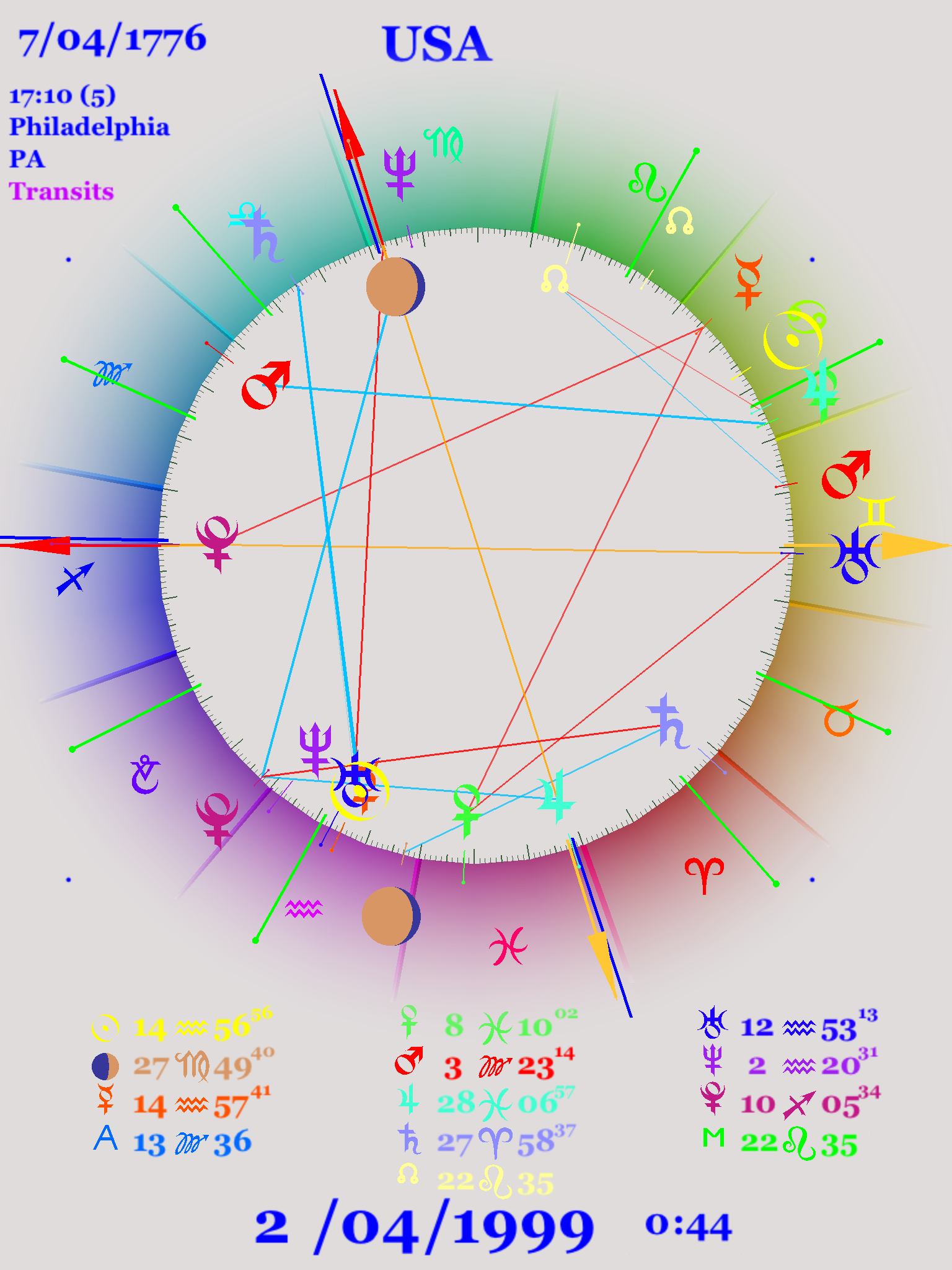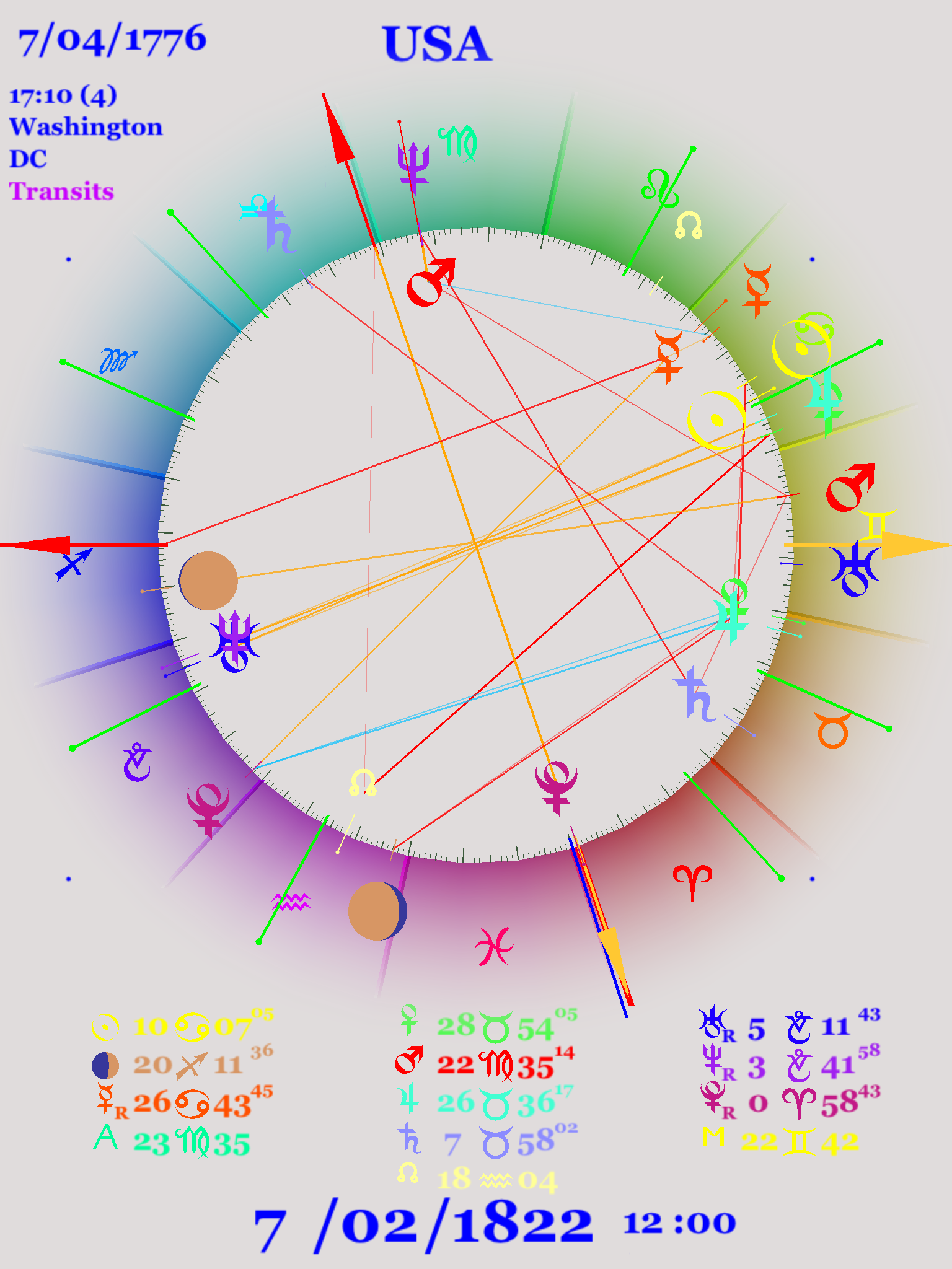 Neptune once again rears its head — Neptune is in hard aspect to the MC and Venus. Saturn opposite the United States Moon.