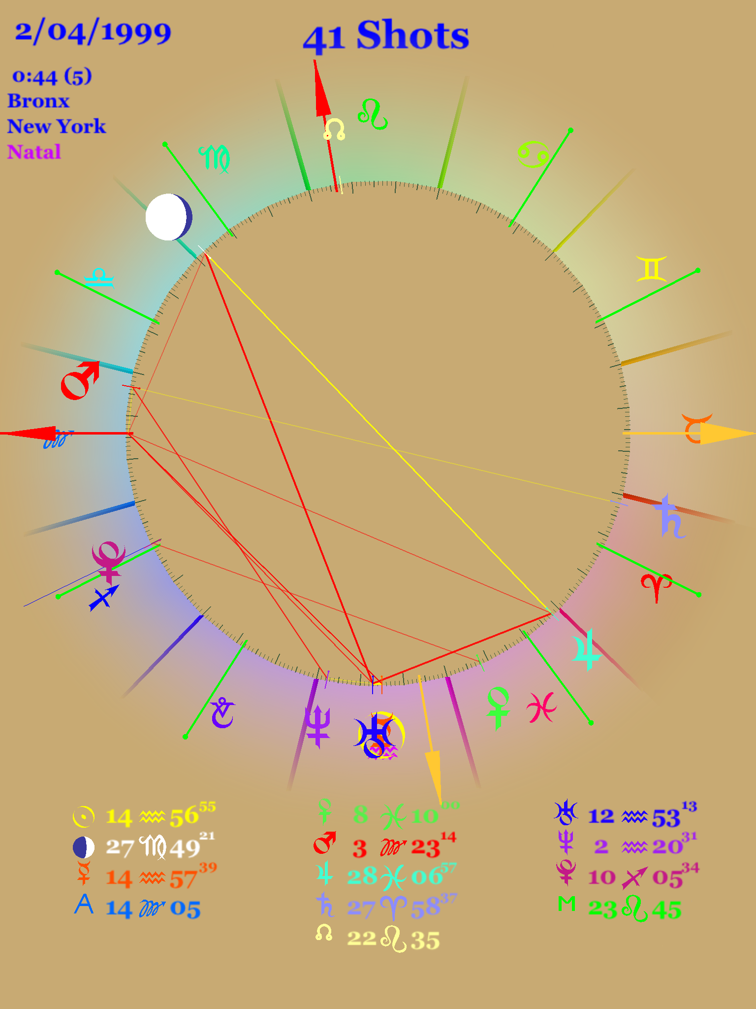 If this killing happen at nine in the evening, the Moon was setting; later and the Moon had already set. The Uranus square Venus (erratic or unexpected relationship) suggests the nature of this event: it was a bachelor party for a wedding — no one expected the groom to be killed at his own party. There is also a grand trine between Saturn, Pluto, and the Midheaven. I’ve talked about Saturn-Pluto combinations before. This is not a hard aspect, but with grand trines behavior becomes stuck in a rut. In this case the rut was cops killing young black men.
