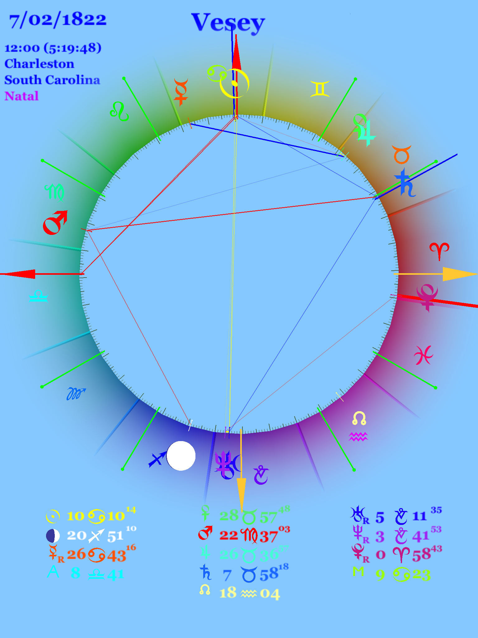 Mars conjunct Saturn indicates harmful or destructive energy, blockage of proper expression of energy. That was certainly true, since nothing much came of this event except more anger. Jupiter-Uranus (Moon over conjunction some time that night): Optimism that things would work out, lucky. The Turnerites thought things would work out so they went for it; unfortunately they were wrong.
