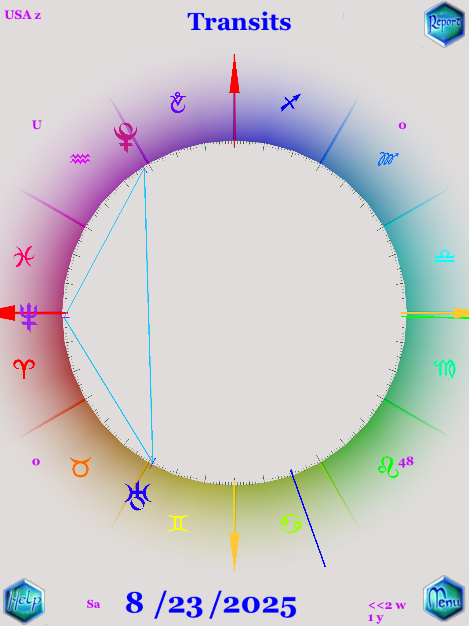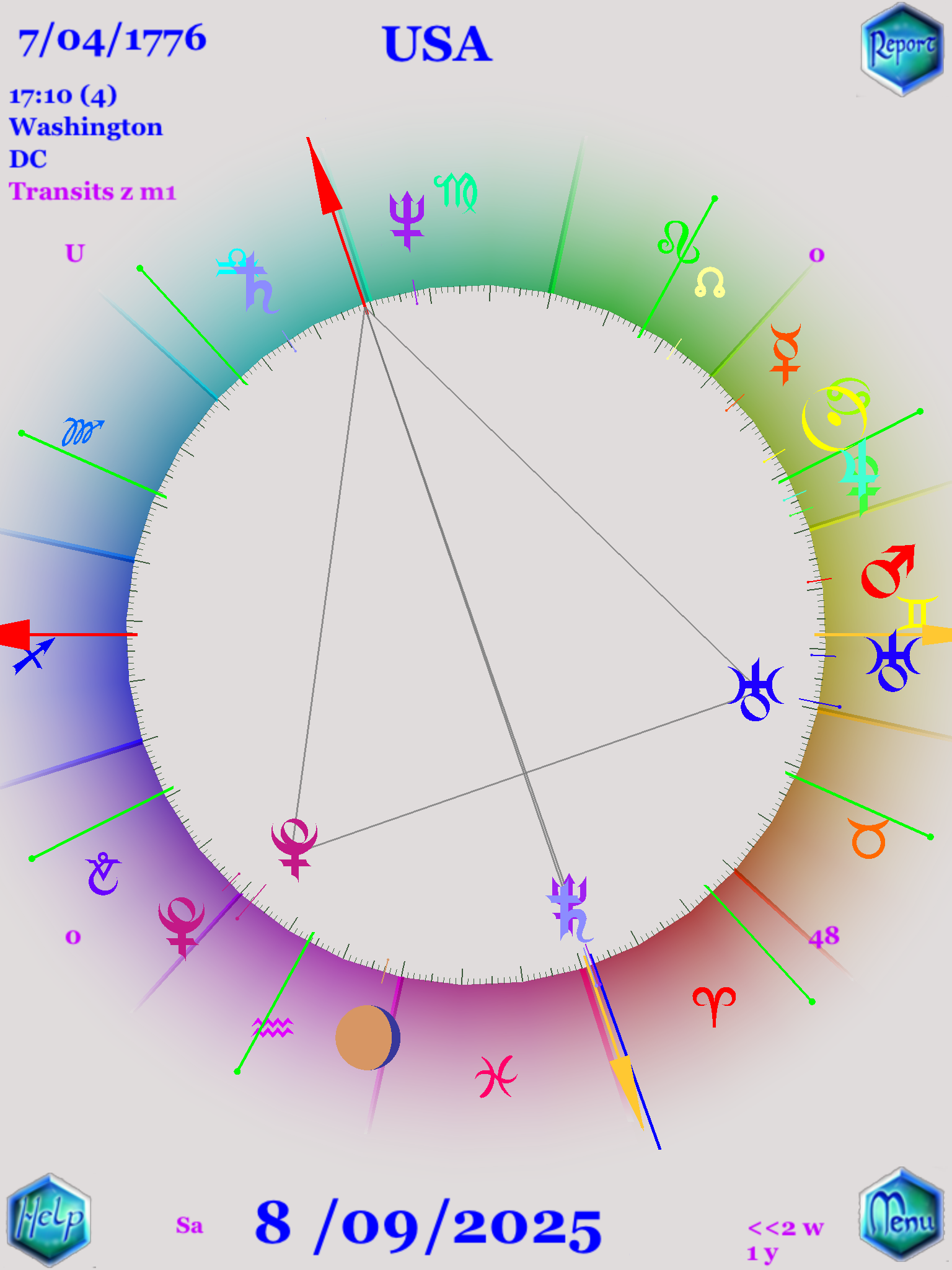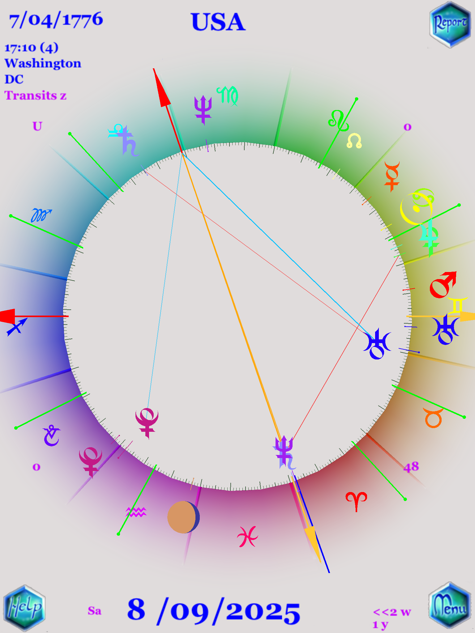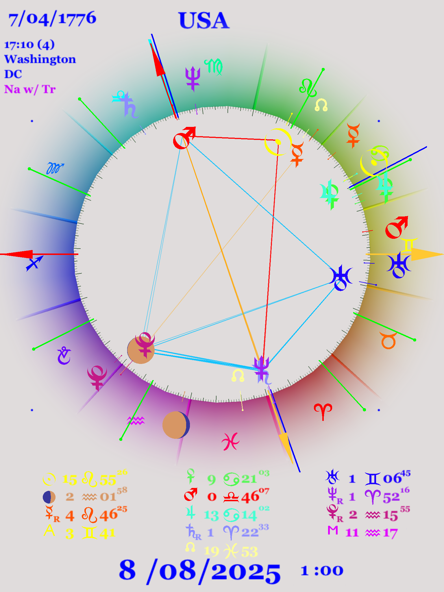 Finally, here is a chart with all the planets within the US chart, for August, 8, 2025. There is a kite — grand trine and mini-grand trine with Mars on the US MC and opposite Saturn-Neptune — the spine of the kite. The transiting Sun is semisquare Mars and sesquiquadrate Saturn-Neptune. Mercury is opposite the Moon-Pluto conjunction. There is a Venus-Jupiter conjunction and Jupiter is almost exactly conjunct the US Sun.