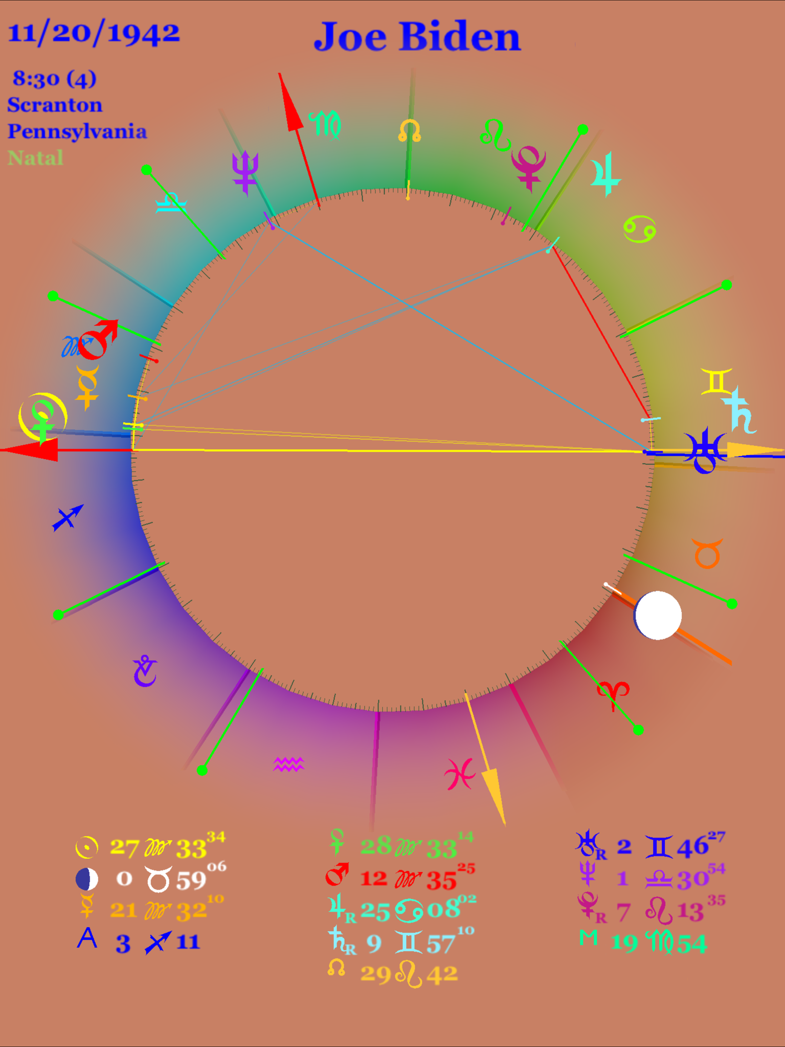 As far as I know there is only one given birth time for Joe Biden. In his chart all planets but one are above the horizon, suggesting a person directed towards the outer world, very comfortably in the public. The Sun-Venus conjunction (one degree in Scorpio) suggests an affectionate nature and willing to show this. Perhaps this in an indication of his famous “handiness” and preference to smelling the hair of young girls. Note that his Uranus is right on the Descendant (it is actually half a degree below, but if the birth time were off by just a couple of minutes, not unlikely, then Uranus would be above the horizon). Uranus here indicates that he attracts rebels or revolutionary people. Perhaps he is a closet Marxist? Note that he is a heavy Scorpio with four personal planets in that sign. The previous Democratic candidate also was a Scorpio. Perhaps his candidacy is the Scorpio revenge, since the sign was denied victory last time. The Sun sign of Scorpio is the most common sign for Presidents, along with Aquarius.