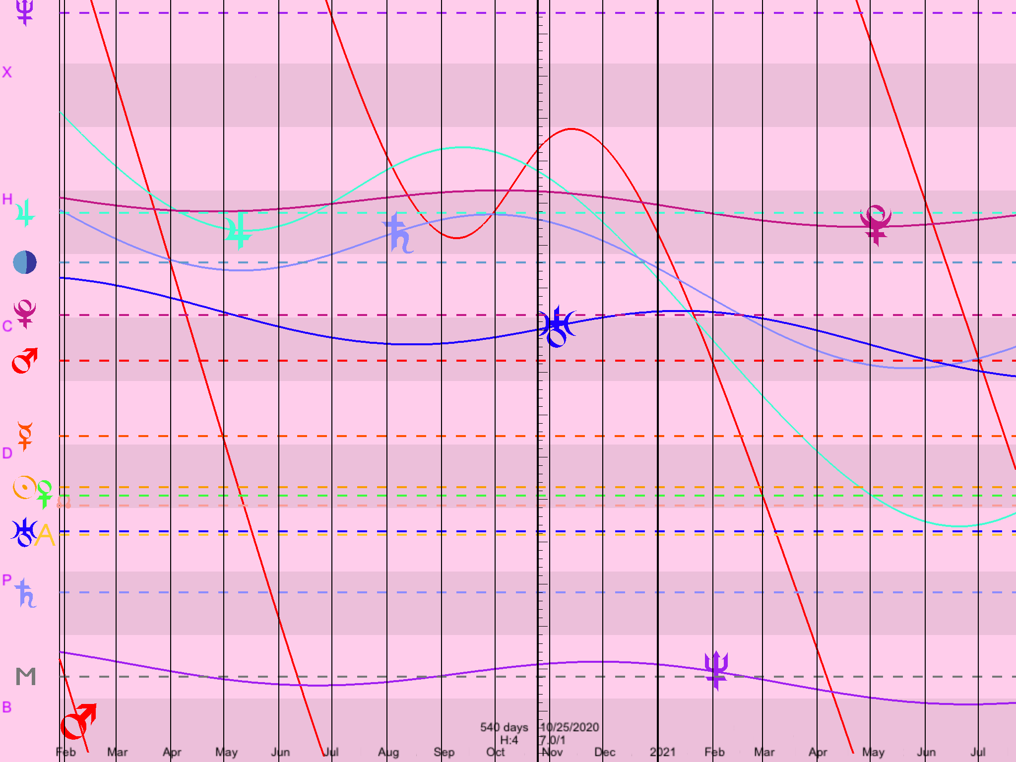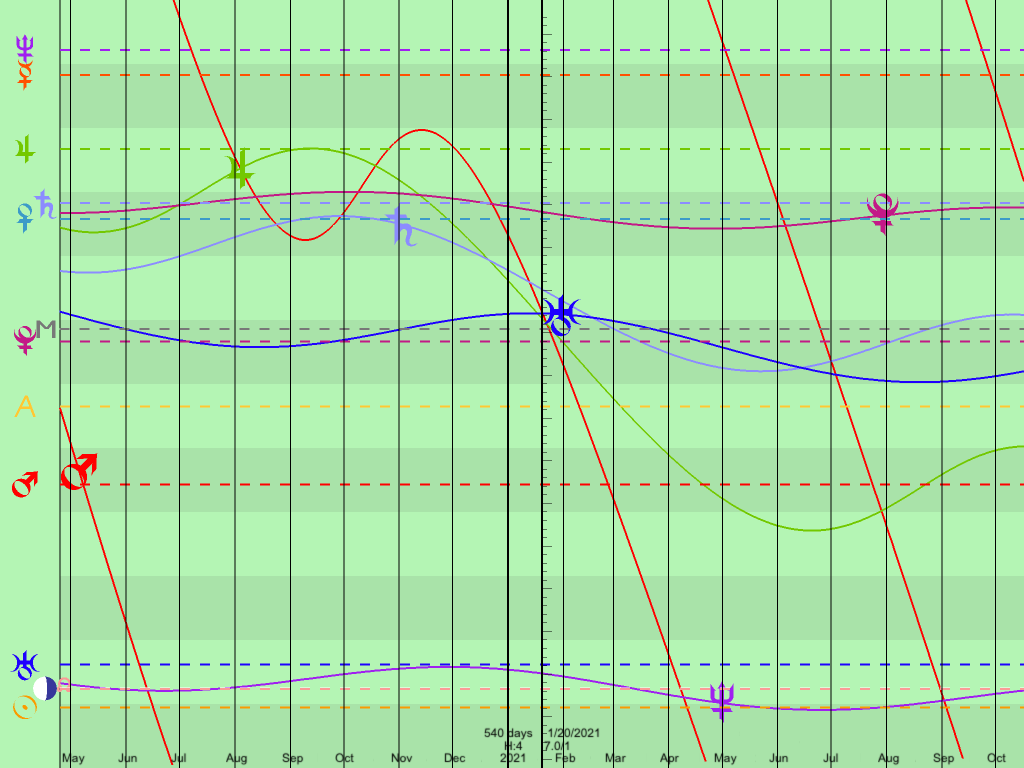 Finally we have the inauguration chart for Trump born at 9:51. While the Mars-Uranus conjunction doesn’t do much in the other natal charts, for this Trump chart that conjunction is on his MC, not surprising because Uranus is on is MC for much of the year, as shown in the graphical ephemeris. This may indicate the uproar if Trump — with this natal chart — loses the election. Or it could indicate the uproar among the Democrats and their media if Trump — again with this chart — wins the election. If you thought the pushback in 2017 was something, wait until you see the response in 2021. Also this will be a good test of which natal chart is more accurate. Stay tuned.