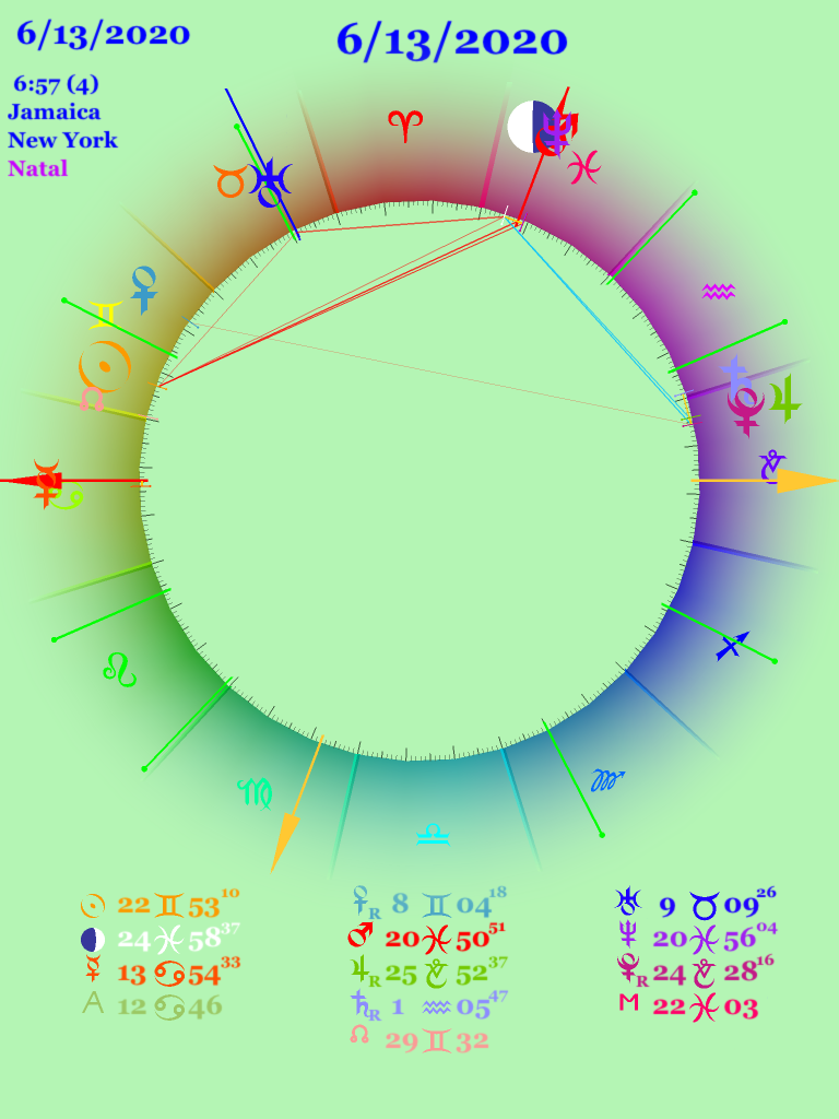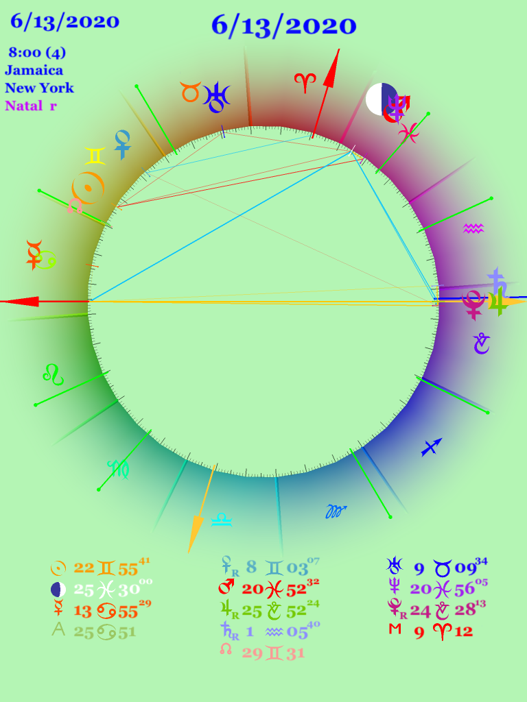 The return of the 9:51 chart shows that all of these planets are above the horizon, more so than in the 10:54 return. That would suggest that in the year to come June 2020 to June 2021 — he will be in the public eye. As in Joe Biden’s 2020 return, Mercury on the Ascendant indicates speaking to the public. The Mars – Neptune conjunction on the Midheaven is problematic. Mars-Neptune usually indicates unfocused or confused action — witness the Mars-Neptune square in the US chart. According to Ebertin, this conjunction on the MC suggest failure and a sense of inferiority, something that Mr. Trump feels from his childhood in Queens, an “inferior” borough compared to Manhattan. Or perhaps it suggests his sense of rejection at having lost the election. The Moon is also on the Midheaven but in the Tenth house suggesting that the public will be very aware of him, but of course that is a given.