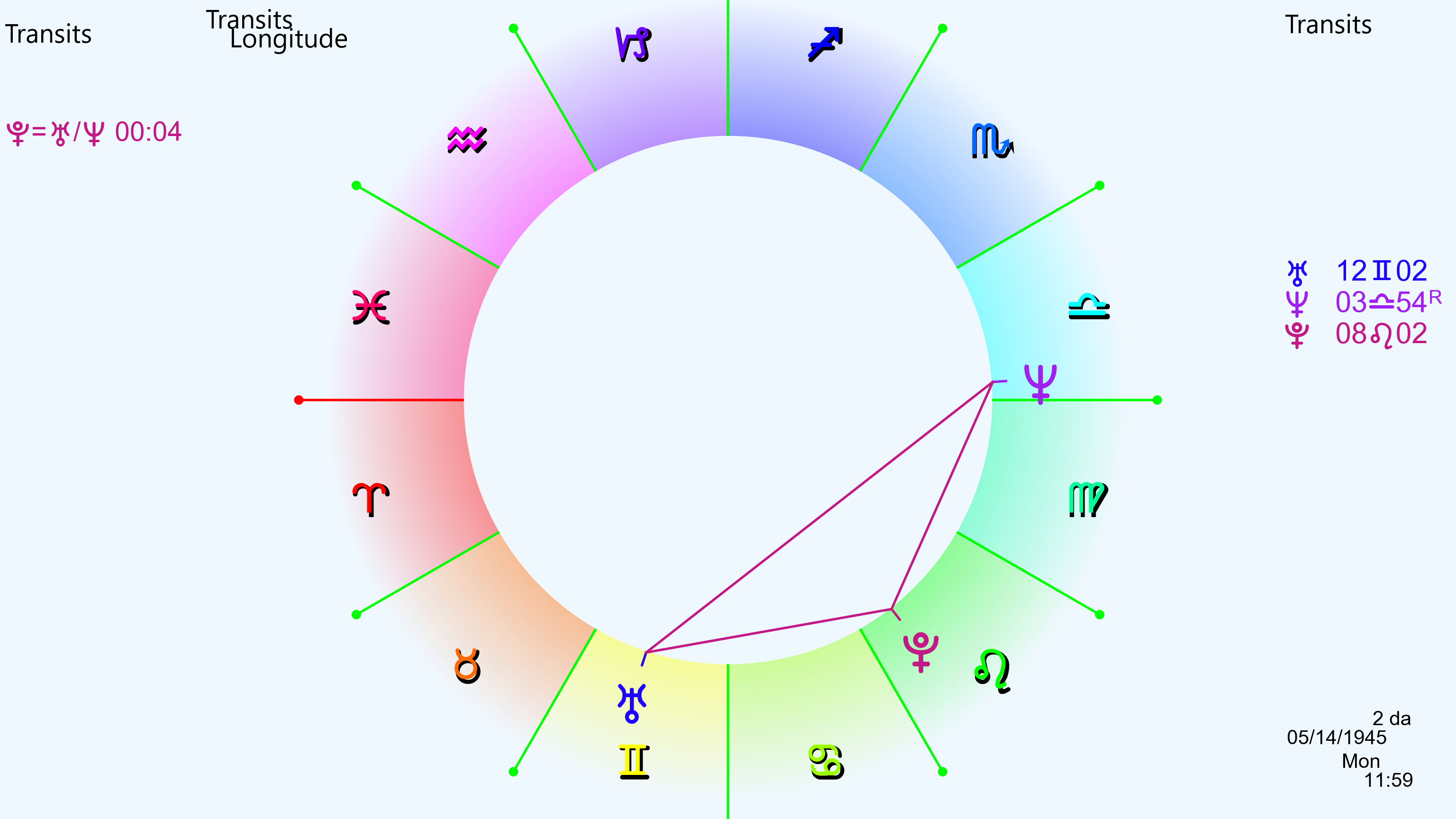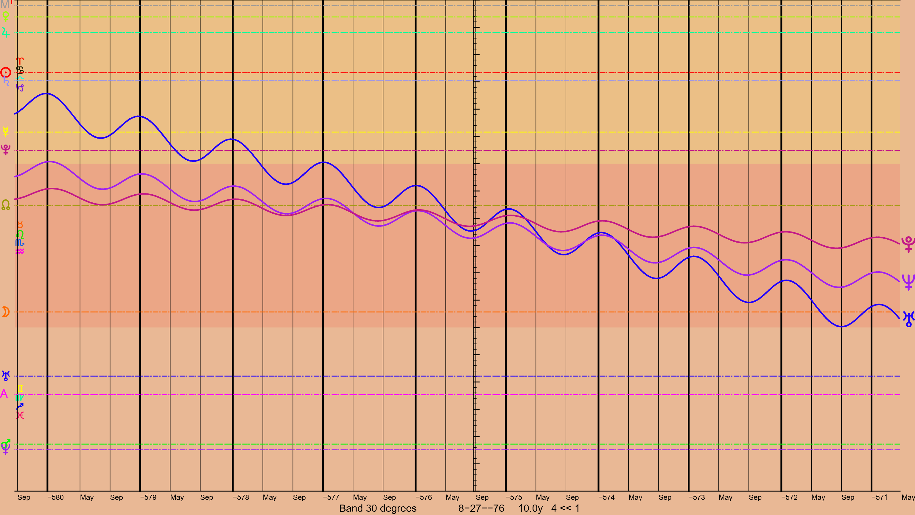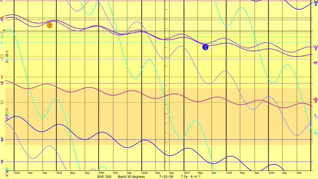 In the above graphical ephemeris the transiting Uranus-Pluto midpoint is in orange and the transiting Neptune is in purple. They first come in contact at One and that connect ends at Two for a period of two years. Compare that to the one shown later for the current period.