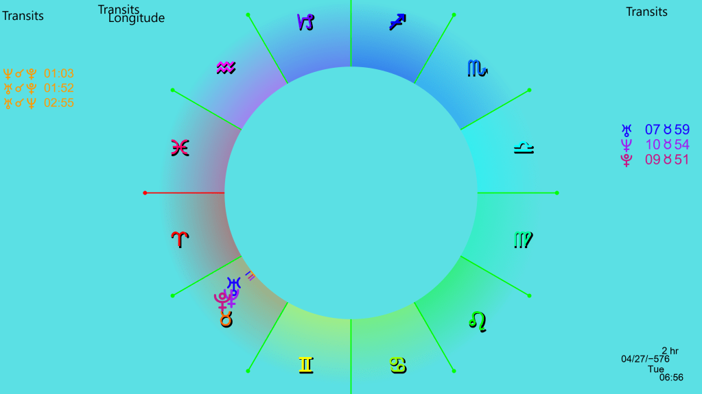 The only comparable time in history that I can think of is when all three planets were conjunct in 576 BC or thereabouts. They also formed a midpoint configuration but it is only because they are conjunct — each three is at the midpoint of the other two. This was the axial age (Karl Jaspers) when most religions originated such as Confucianism, Lao Tzu, Zoroastrianism, Mithraism, Judaism (Babylonian Captivity).