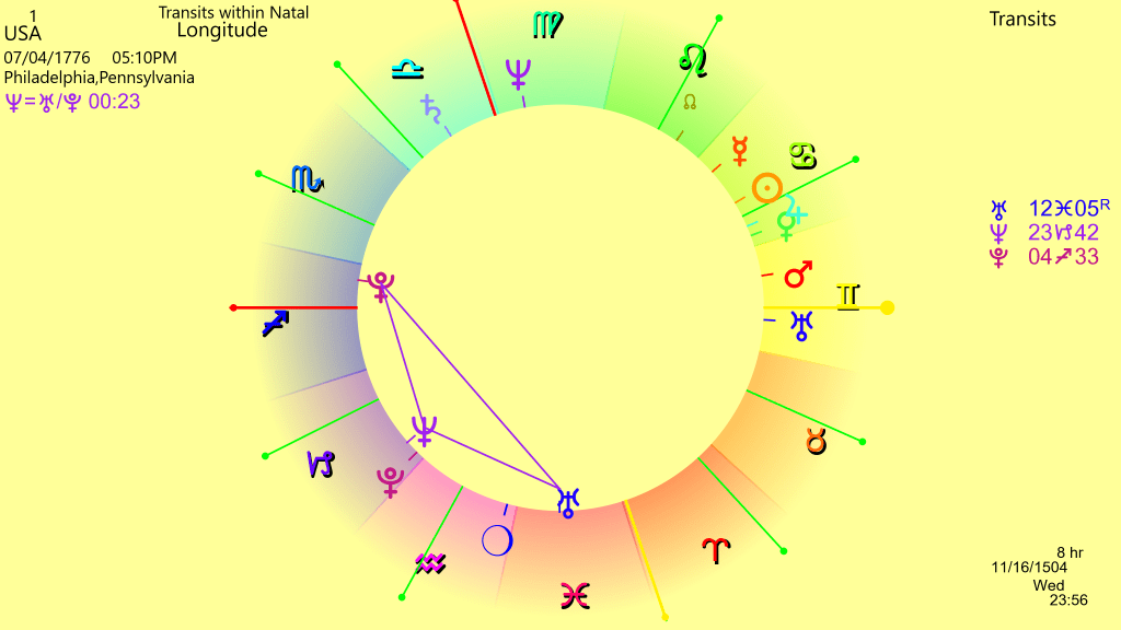 But once every 500 years there is an outer planet midpoint with Neptune as the apex planet, and that is the type we are having now. Thus this zeitgeist change will be bigger by far than just a normal change which would only be a simple IT. The last time Neptune was at the midpoint was 500 years ago — see graphical ephemeris of this period below — and I think most would agree that the world at the time changed in very significant ways, with among other things the newly invented printing press and the discovery of the New World.