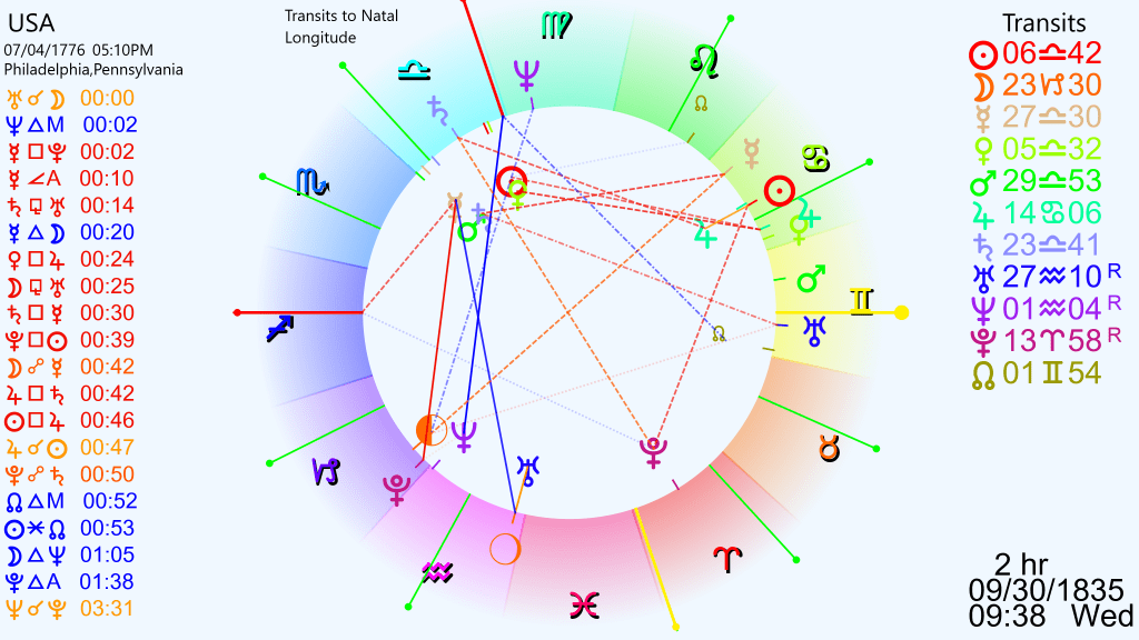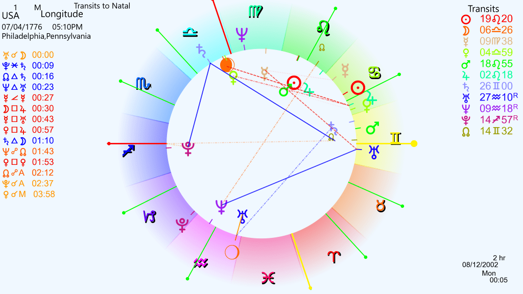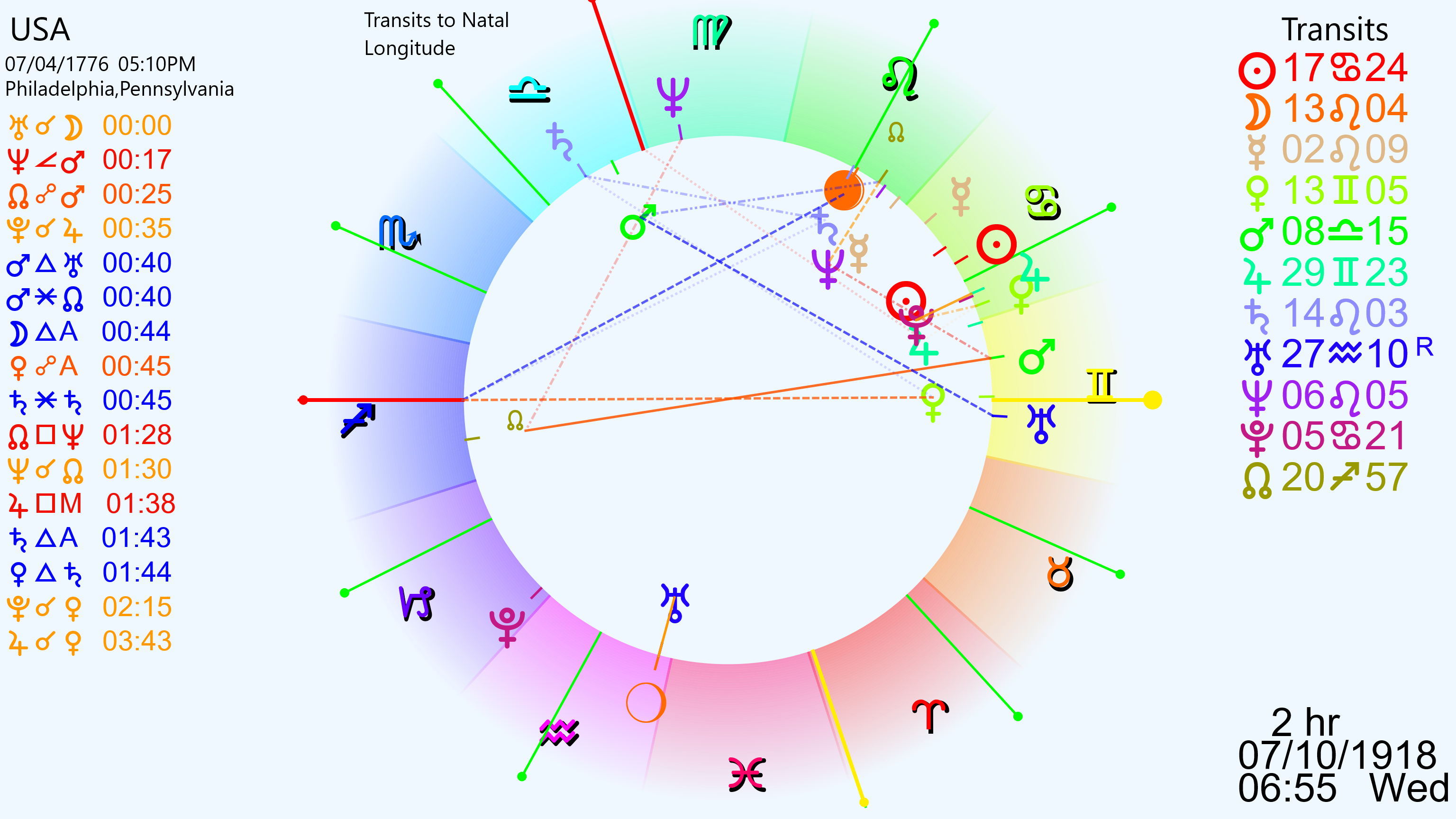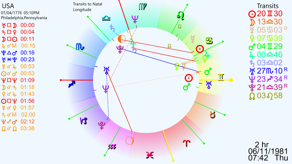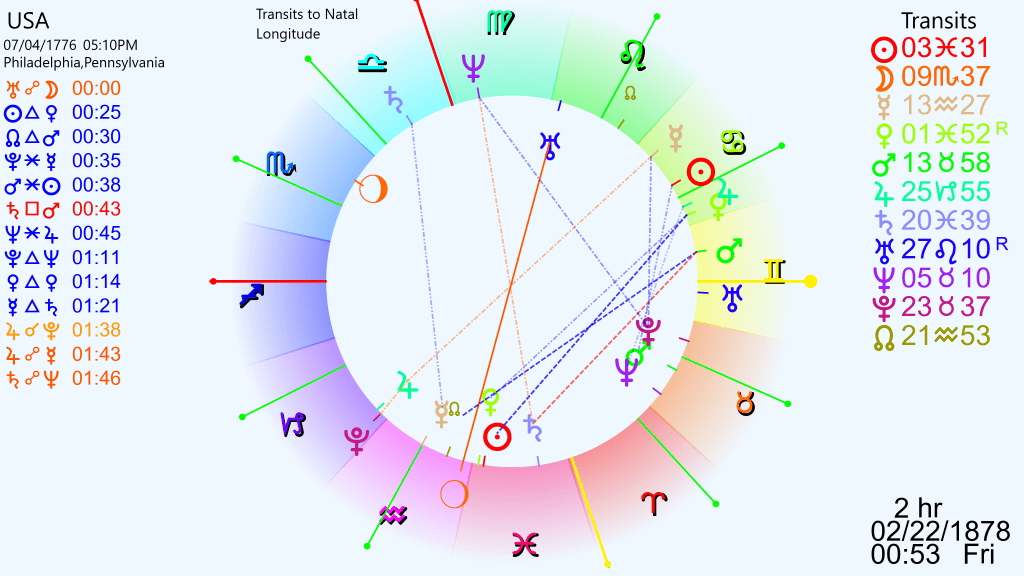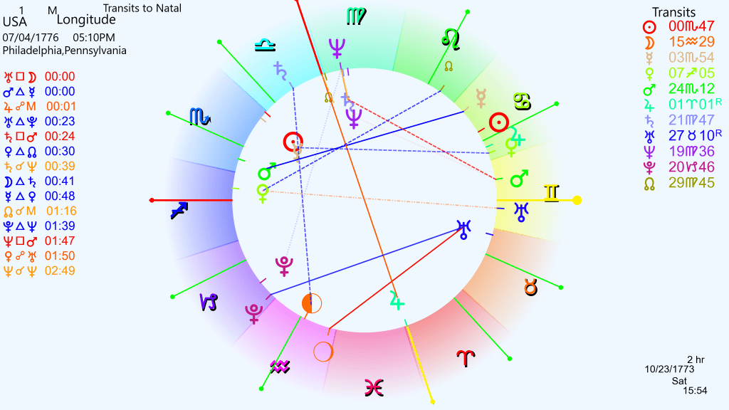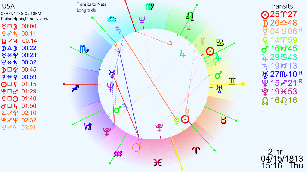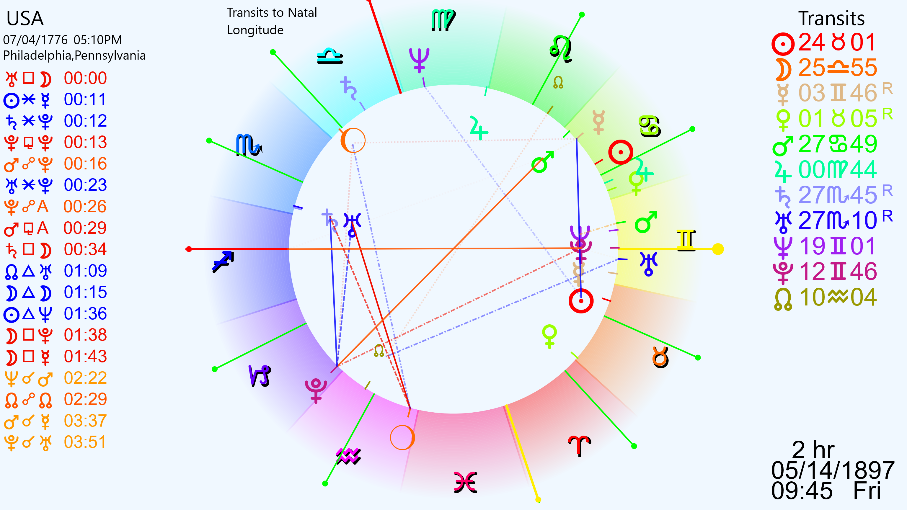Uranus in hard aspect — conjunction, square, opposition — to the natal moon of the United States is coming up. The first pass is in August and September of 2024 when it goes stationary retrograde right on the Moon; needless to say this is right before the November presidential election of that country. Then in the middle of May 2025 it makes a direct square to the Moon (and also a trine to Natal Pluto). Finally in February of 2026 it goes stationary direct within a quarter degree of the Moon. The United States will experience three years of Uranus squaring its Moon (along with many other interesting aspects that will be discussed in later posts) so it is instructive to look back at previous hard aspects between these two planets during the history of the country.