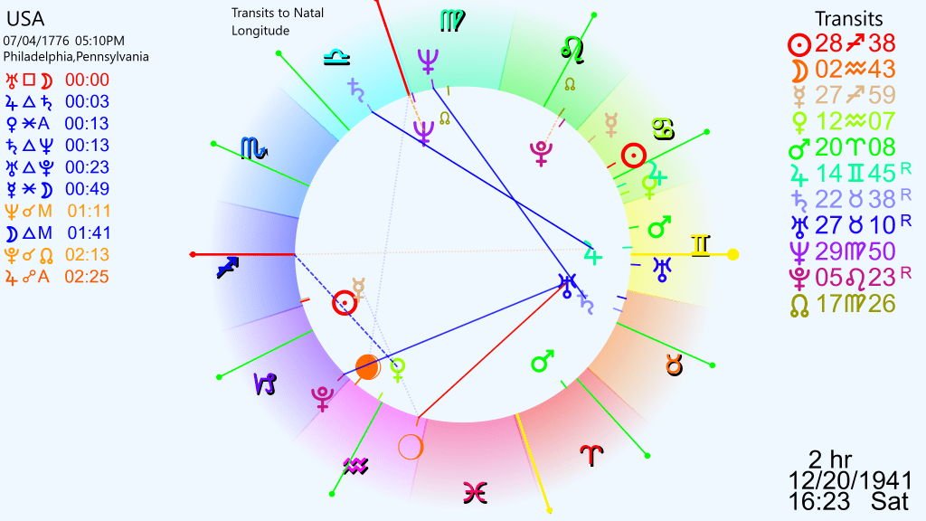 In 1941 and 1942 Uranus squared the Moon in the same type of square that is coming up — this period was 84 years ago — one Uranus cycle before now. In fact the second exact transit of this cycle was on December 20, 1941, less than two weeks after the attack on Pearl Harbor that got America involved in World War II. The American people weren’t terribly convinced of the need to get involved in a war that seemed mostly in Europe, but after this square (“A date that will live in infamy”) there was much more eagerness to go to war.