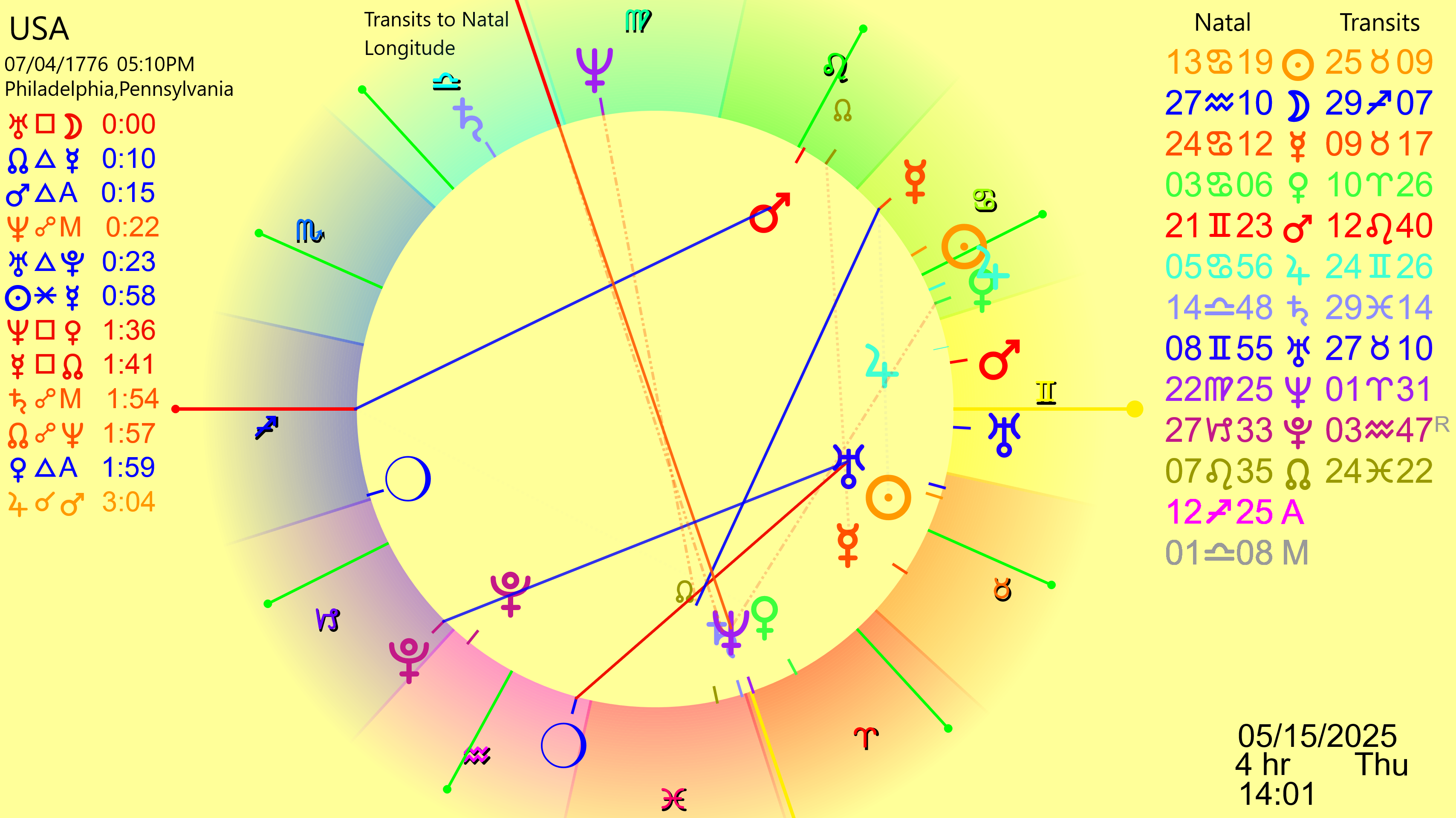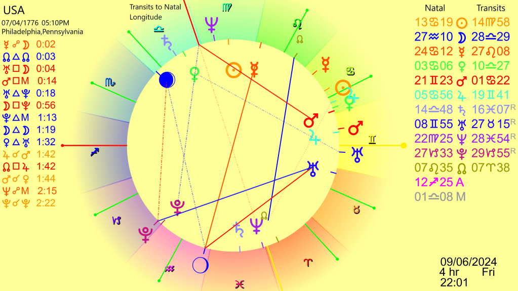 Uranus turns stationary retrograde on the US Moon in the last half of 2024, just before the Presidential election. It then makes a clean true pass in early summer of 2025. Finally it goes stationary direct on the natal moon in late winter 2026.