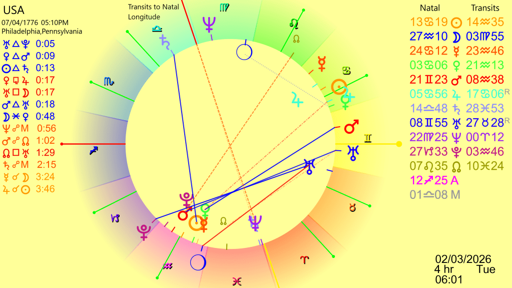 Over the last few blog posts we’ve seen the important aspects which signify that the second half of this decade will be quite different than the first half. I discussed previously the Jupiter-Saturn square that signifies the beginning of the second half of the decade. Later I discussed the Saturn-Neptune conjunction that happens shortly after the third Jupiter-Saturn square and then finally in February 2026. This time we will discuss an important transit to the US chart that first occurs in late summer of 2024 (elections season) and will occur finally in early 2026 and that is transiting Uranus square the natal Moon.