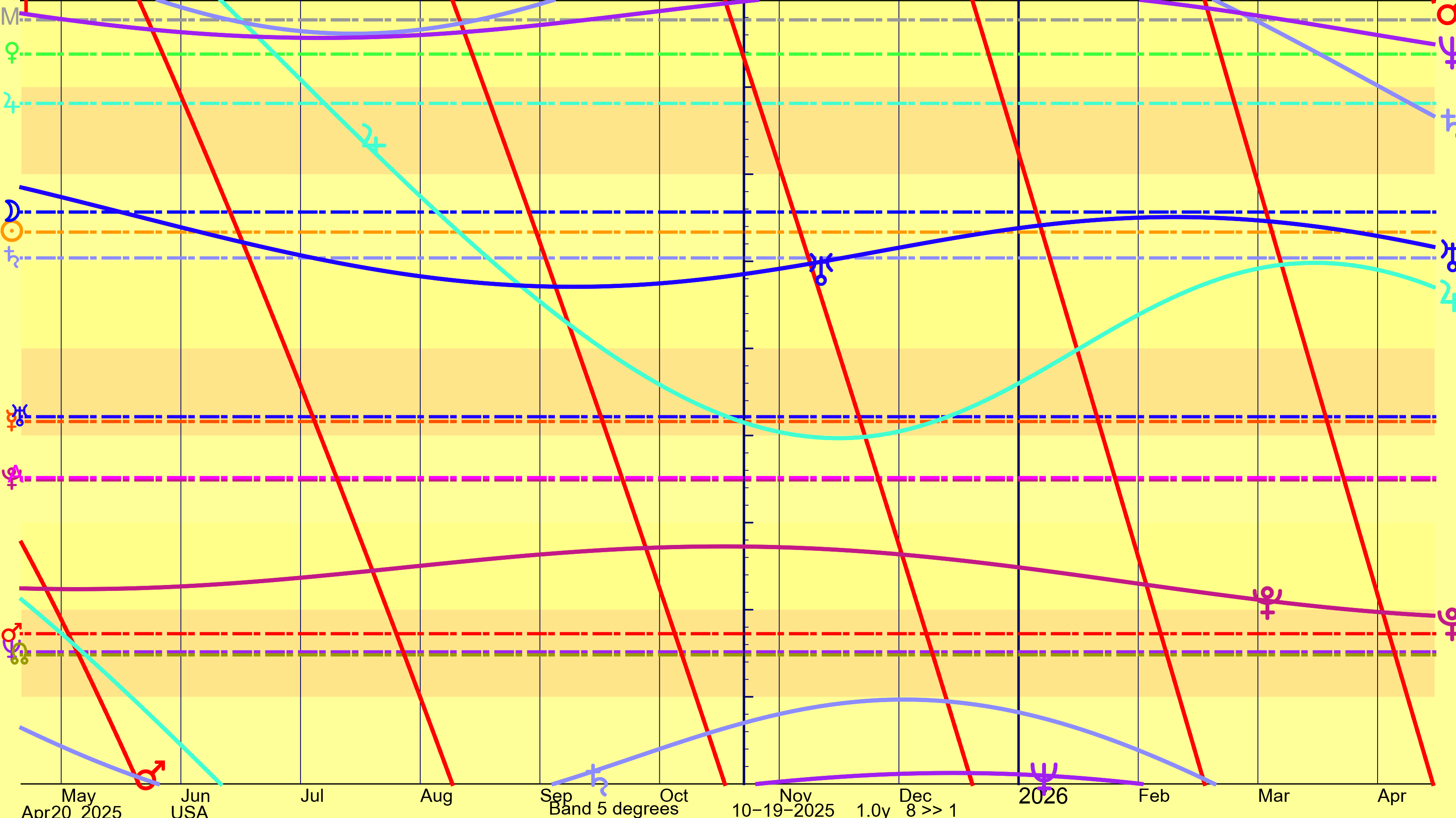 Finally here is a graphical ephemeris to show Uranus making a semisquare to the Sun at about the same time as it makes a square to the Moon. We see this happens in early June of 2025, December of 2025, and April of 2026.