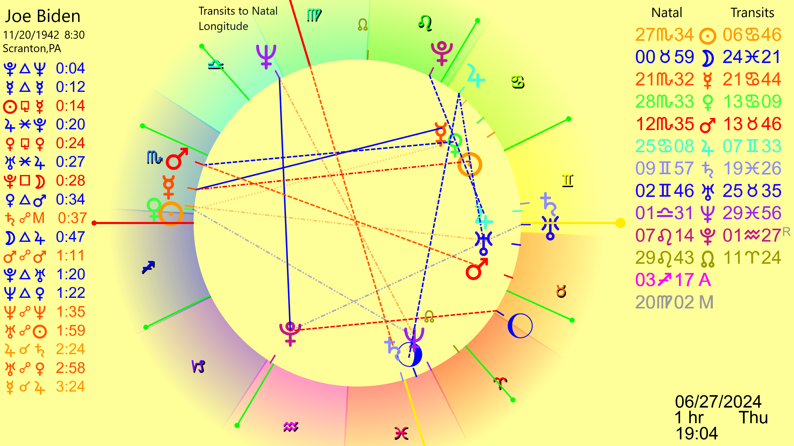 Things really started to change with the debate between Presidents Biden and Trump, much earlier than is normal for Presidential debates. Here is a chart for the start of the debate between Biden and Trump on Biden’s natal. The first thing to notice is that Saturn is on his nadir. It has been found that a person’s connection/popularity with the outside world is shown by the position of Saturn in the chart: When it is at the Midheaven the world recognizes you and when it is at the nadir your popularity is also at its nadir. The second thing to notice is that Pluto is square his Moon. Also the Neptune is opposite is natal Neptune so he is facing a Neptune demi-return, just as the United States recently did and as Ted Kazinski — mentioned a few posts ago — did at his death.