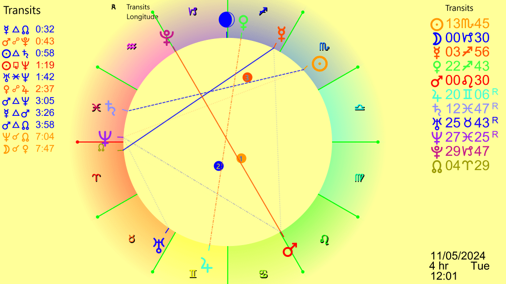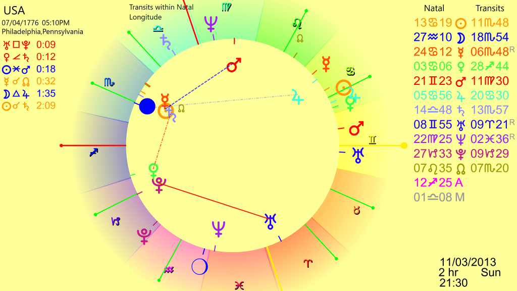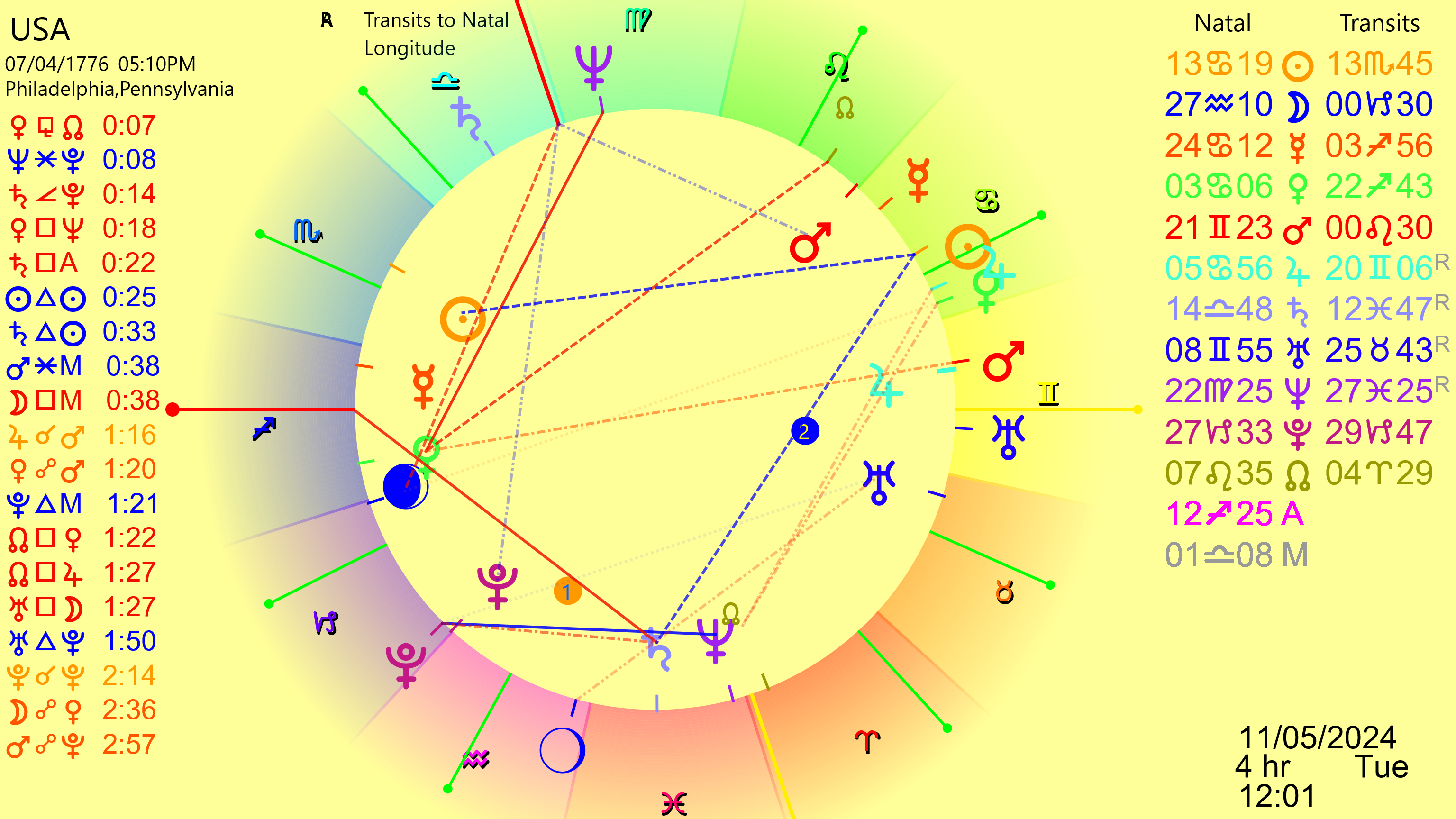 Next let us look at those transit as they impinge the US chart. Saturn is square the US Ascendant (1) and trine the US Sun(2), again suggesting a conservative outcome. But of course what “conservative” means in this situation and which candidate is most conservative is an open question which I will leave up to the reader. I think the election will have “Conservative” results but these only mask the major changes that will develop in the next year.