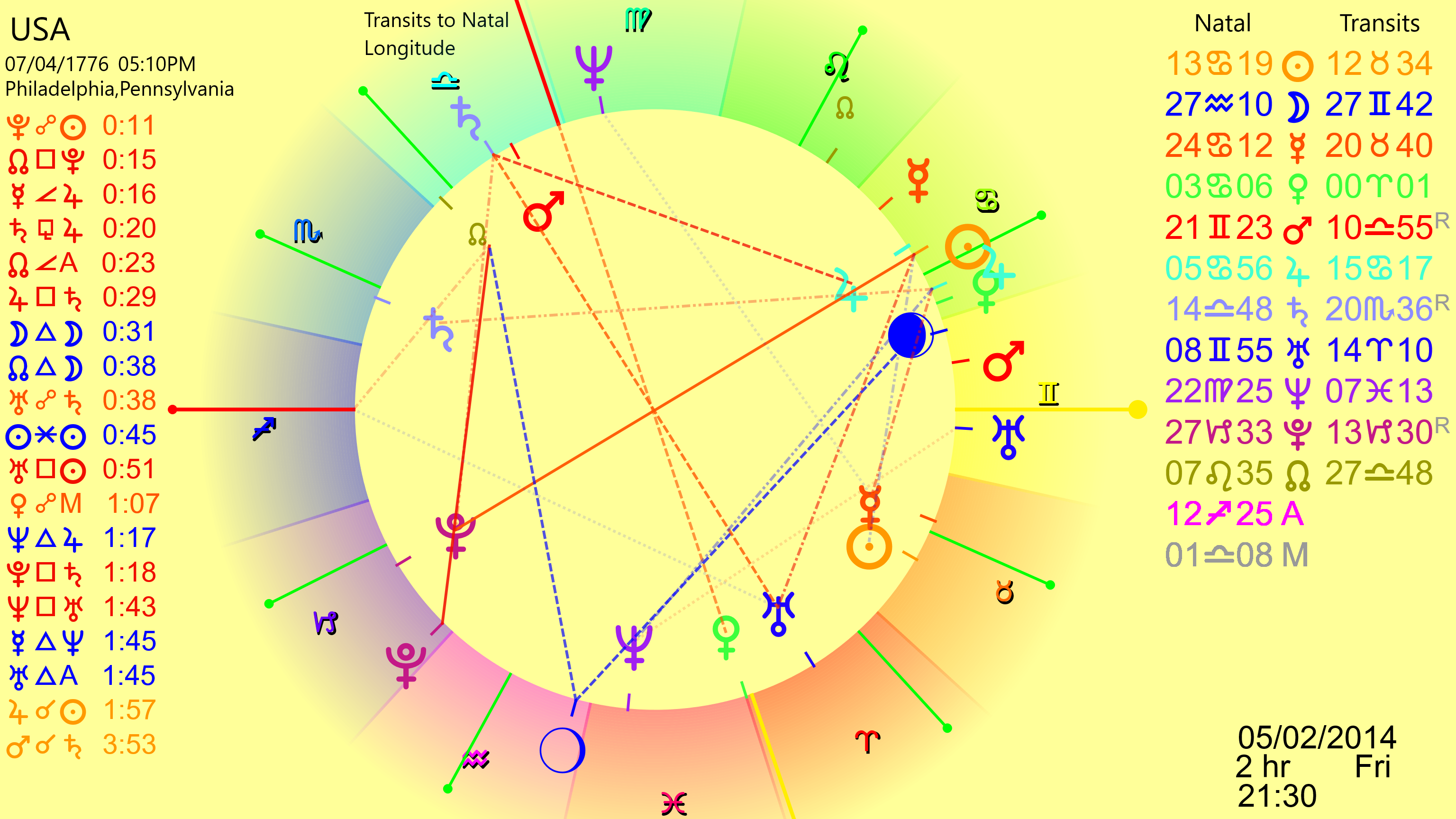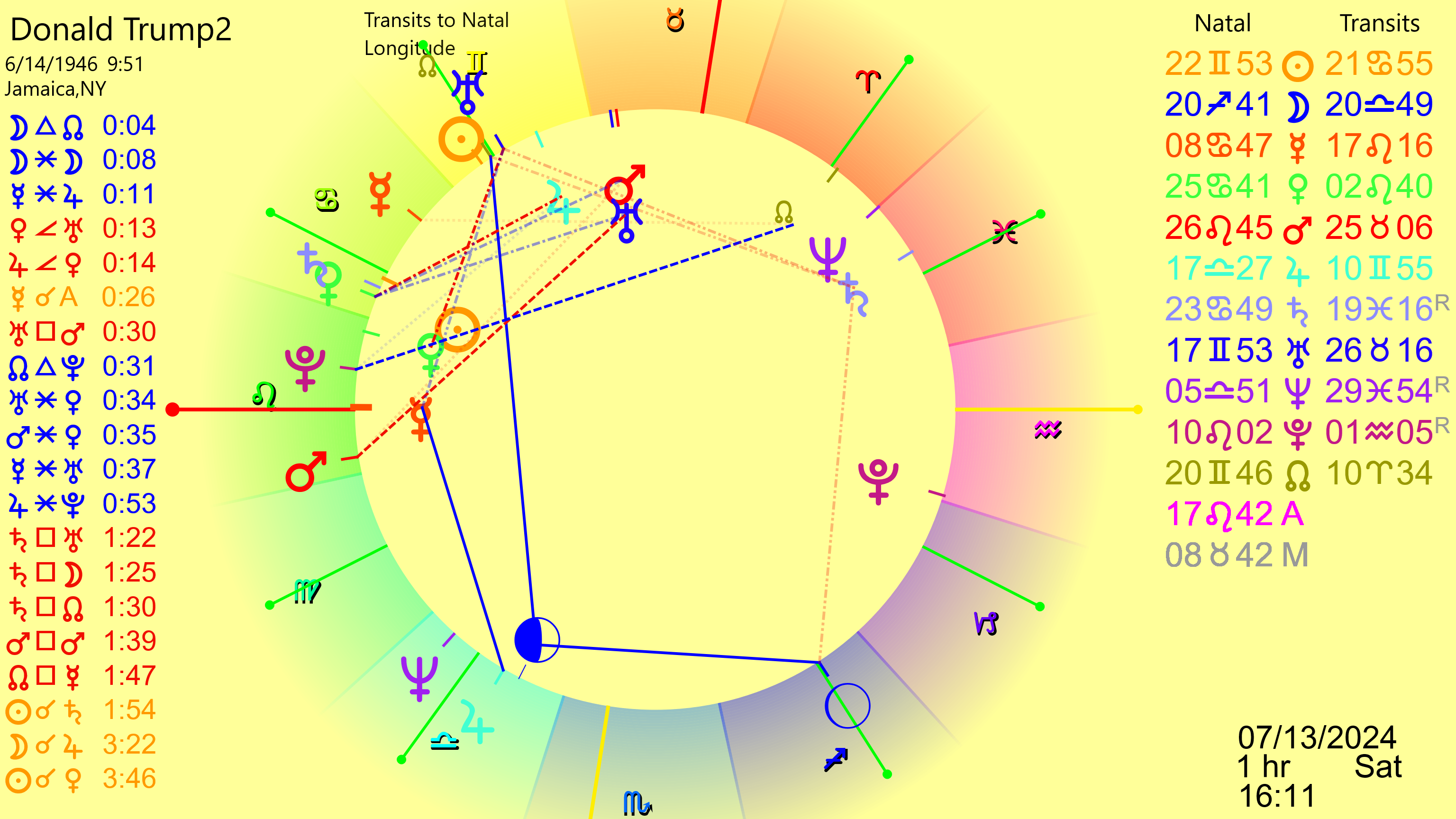Note I use a chart for Donald Trump that is about an hour earlier than the “standard” birth time. This does not make a difference to the transits considered here. But this time is from the Trump family astrologer who worked for a local newspaper. It gives him Leo rising rather than the first degree of Virgo rising,