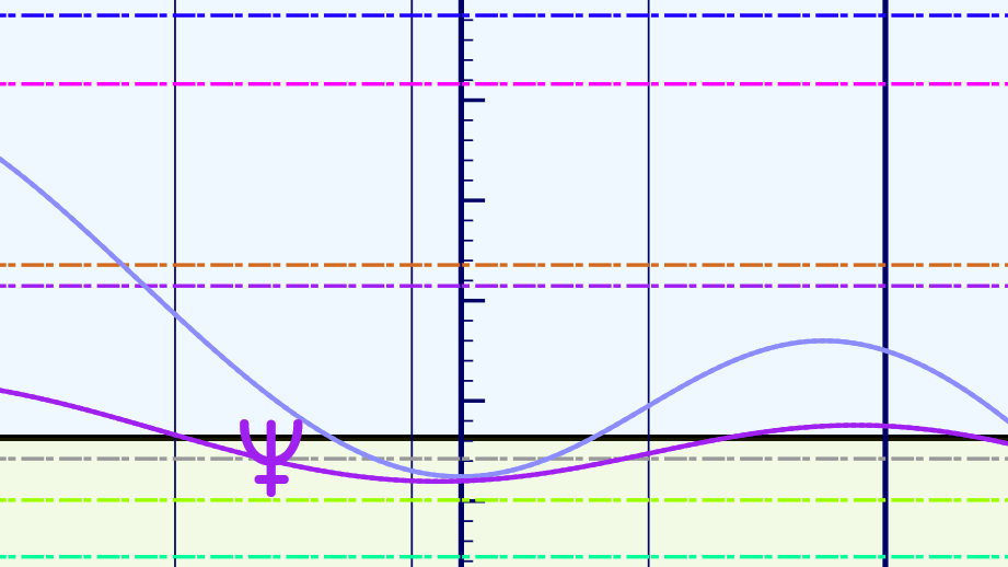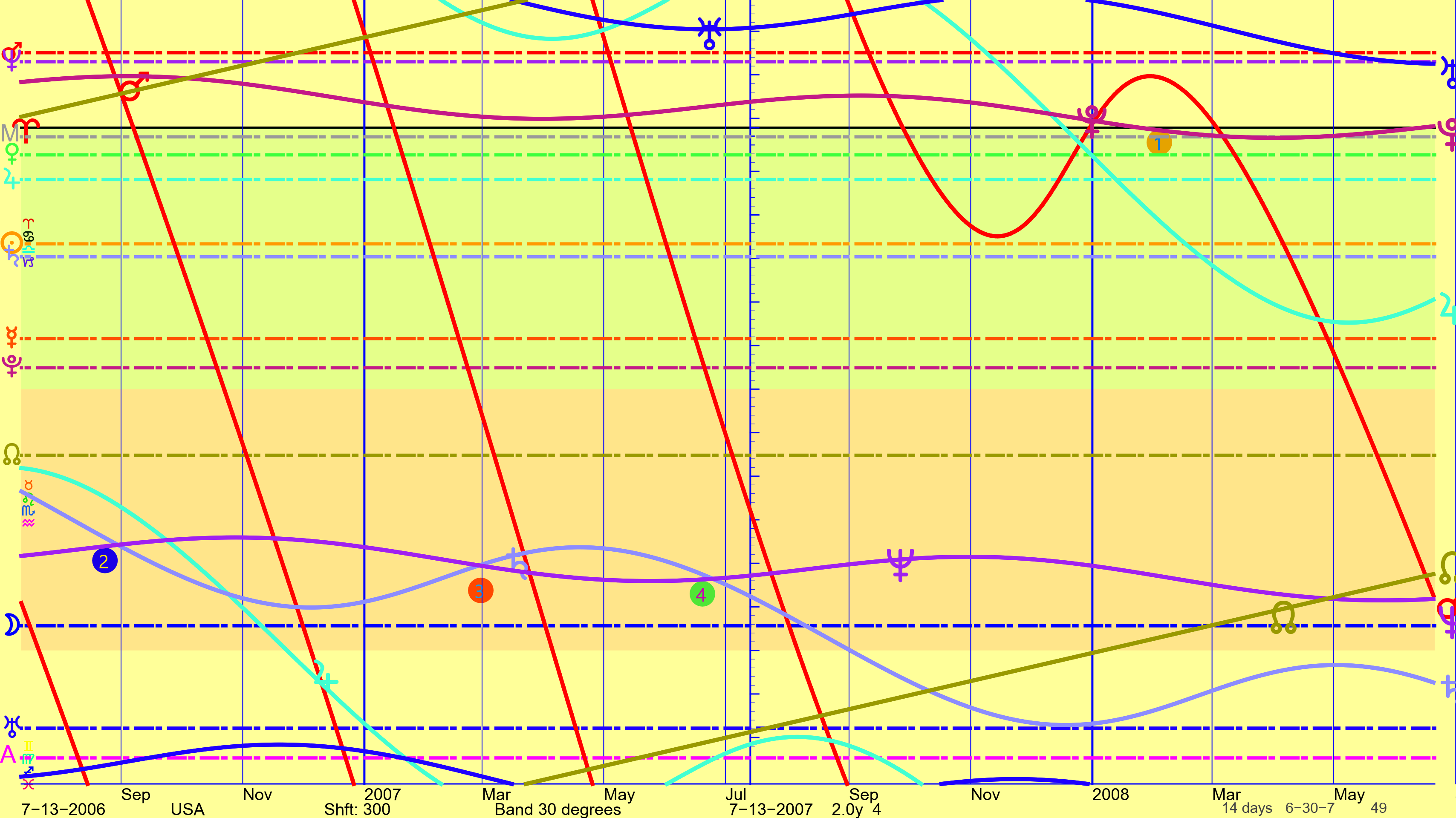 If we examine a magnified section of a graphical ephemeris we can see just how close this conjunction is to both the Aries Point (solid horizontal black line) and the Midheaven (dashed light grey line) of the United States. It is midway between those two points which are in fact close together. So not only do we have Saturn conjunct Neptune at the Aries point, incredibly significant to the world at large (which is represented by the Aries Point since everyone in the world has the Aries Point in common) but also this conjunction is directly opposite the MC of the US — conjunct the IC — and thus the base or foundation of the United States — which is what is represented by the IC — is directly hit by this conjunction. This will certainly shake up the foundations of the United States, which will affect the whole world, but you already can see that.