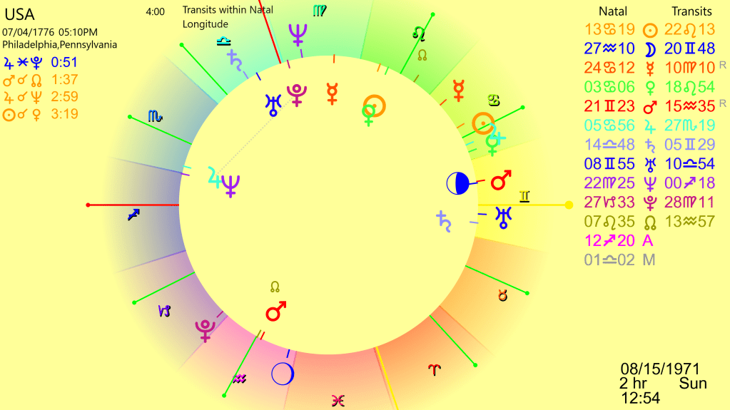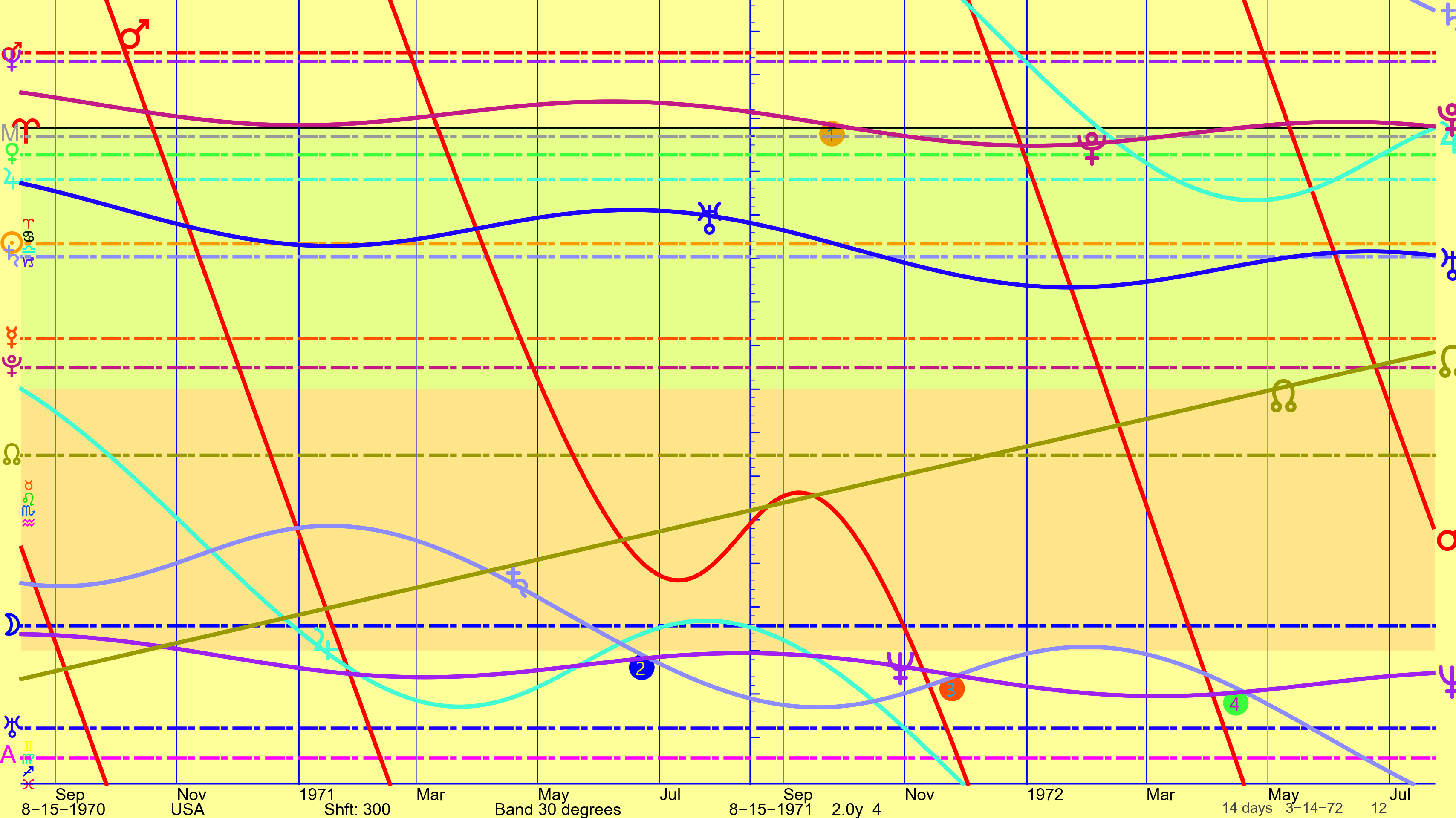 When we look at the chart for August 15, 1971 we don’t see anything specific. But looking at the graphical ephemeris around that date reveals something interesting.
