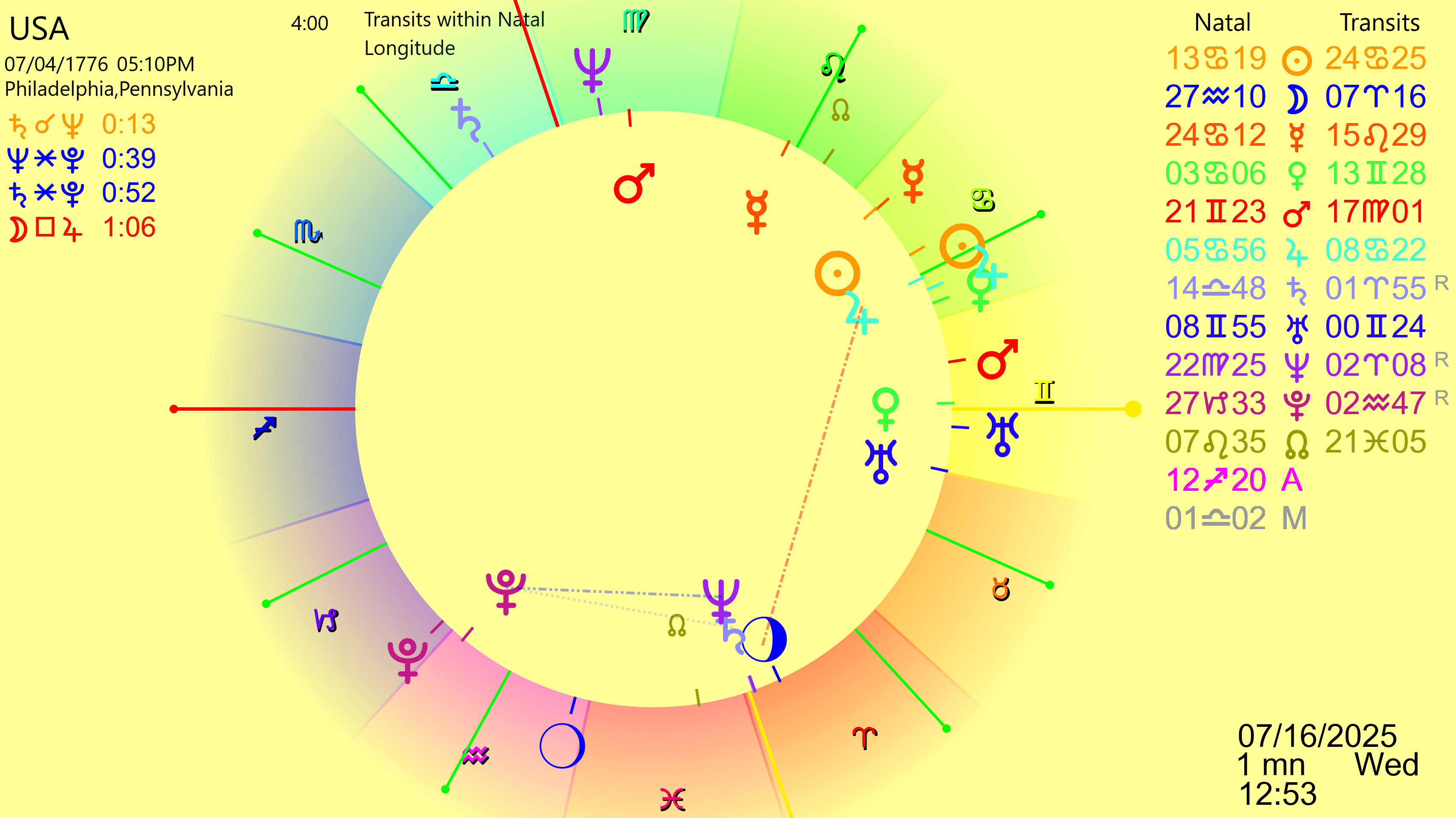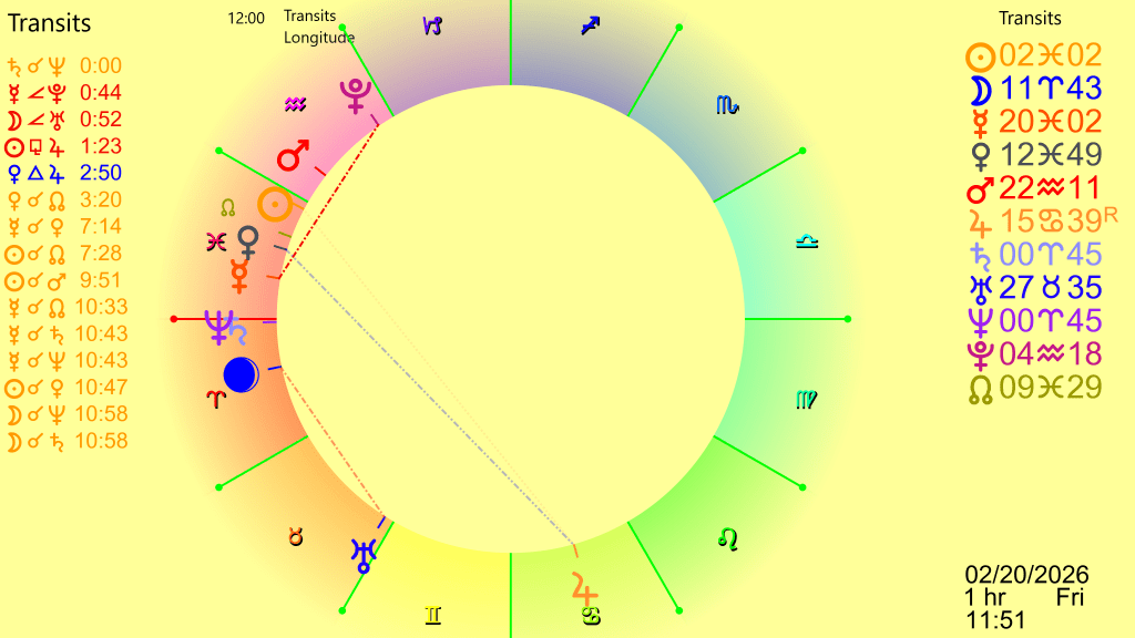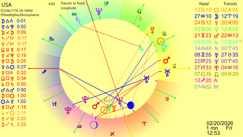 Notice that the event of note doesn’t always happen at the time of the exact aspect. It did for the fall of the Wall, but for both the Nixon Shock and the Great Recession there was a time delay. Thus whether or not a significant event happens close to February 2026 or is delayed months is something we will see. Stay tuned….