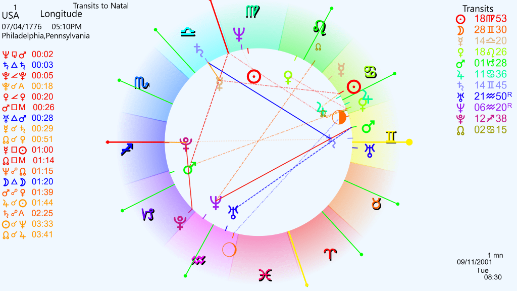 Before 9/11 I seldom thought about a birth chart for the United States, but if I did it was the “Gemini Rising” chart which is set at two in the morning. Of course I read Dane Rudhyar’s book (The Astrology of America’s Destiny) that tries to rectify the Sibley chart made by an English astrologer — Ebenezer Sibley — for the time that he thought the country was “born” but set in England where he was. But on 9/11 I became convinced of the validity of the Sibly chart. If you were to pick a chart representing 9/11 for America you could best come up with that chart that really is. Hard Saturn Pluto aspects, as we’ve talked about before in this blog, are especially serious (Tarnas has a whole chapter about this). The last conjunction of those two planets was in January 2020 and we know what happened then. 9/11 was the previous opposition, and furthermore Pluto was on the Ascendant of the United States, and it isn’t just an expression that we were blasted by Pluto. I don’t think there has been such a clear attack on America’s homeland since the War of 1812. The whole outward expression of the United States (but not its essence) was transformed on that date.