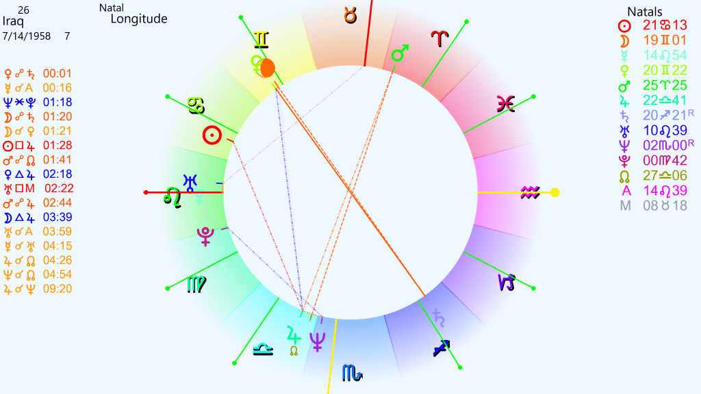 The chart for the Republic of Iraq, which was the nation before the invasion of that country by America — it now has a new birth chart — was for July 17, 1958, even though there was a coup in 1968 that saw Saddam Hussein put into power. A prominent feature of this chart is the Saturn opposition to the Moon-Venus conjunction with the Saturn opposite Venus being almost exact. It looks difficult for women in that country.