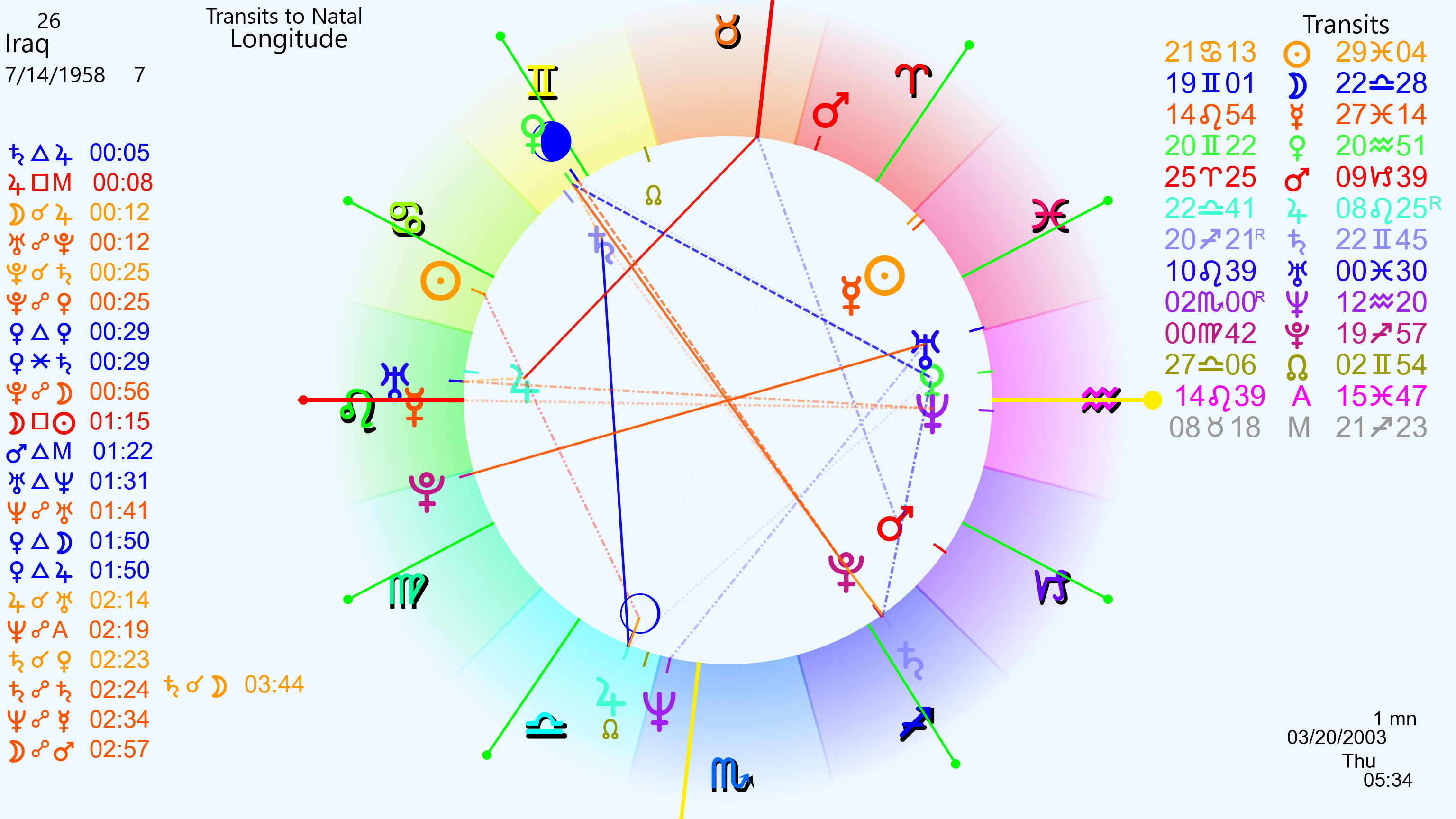 At the time of the American invasion of Iraq the Saturn Pluto opposition that was prominent in both the 9/11 chart and the event chart for the invasion was again important. In this case that opposition fell on the Moon-Venus opposite Saturn configuration of the Republic of Iraq with the transiting Pluto being also exactly opposite the Moon; surely this invasion was difficult but transformative (in one way or another) for the people of Iraq. Twenty year later they are still living with the results of that invasion and a new country (with a new chart) has been born.