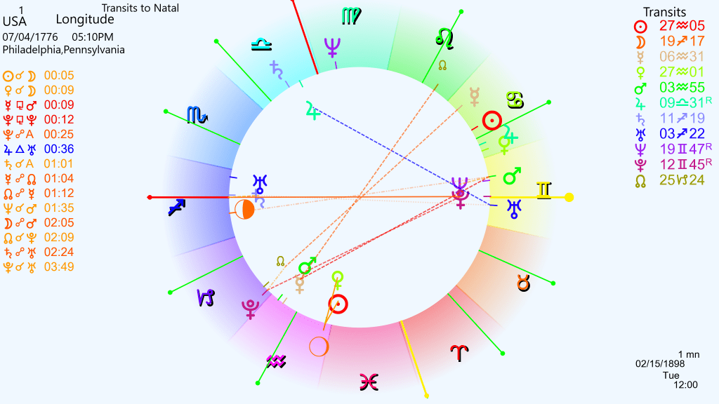 The Sun square Saturn in the US chart was highlighted by this grand cross since Mars is conjunct the natal Saturn. Normally Sun square Saturn would suggest an inferiority complex, a certain restriction on one’s life force. No one would say that applies to the United States. Of course, having Sun conjunct Jupiter and Venus, the “Greater Benefic” and the “Lesser Benefic” in traditional astrology certainly helps counteract this tendency. But deep down the country has an inferiority complex involving how it has treated other people, especially black and native people, but it has tried hard to ignore that square for a long time. That repressed Sun square Saturn is now coming into the fore because of the emphasis given to it by the grand cross and you can see all of this in discussions involving racism, white privilege, etc. The people and the government of the United States are acting out this square but not really dealing with it.