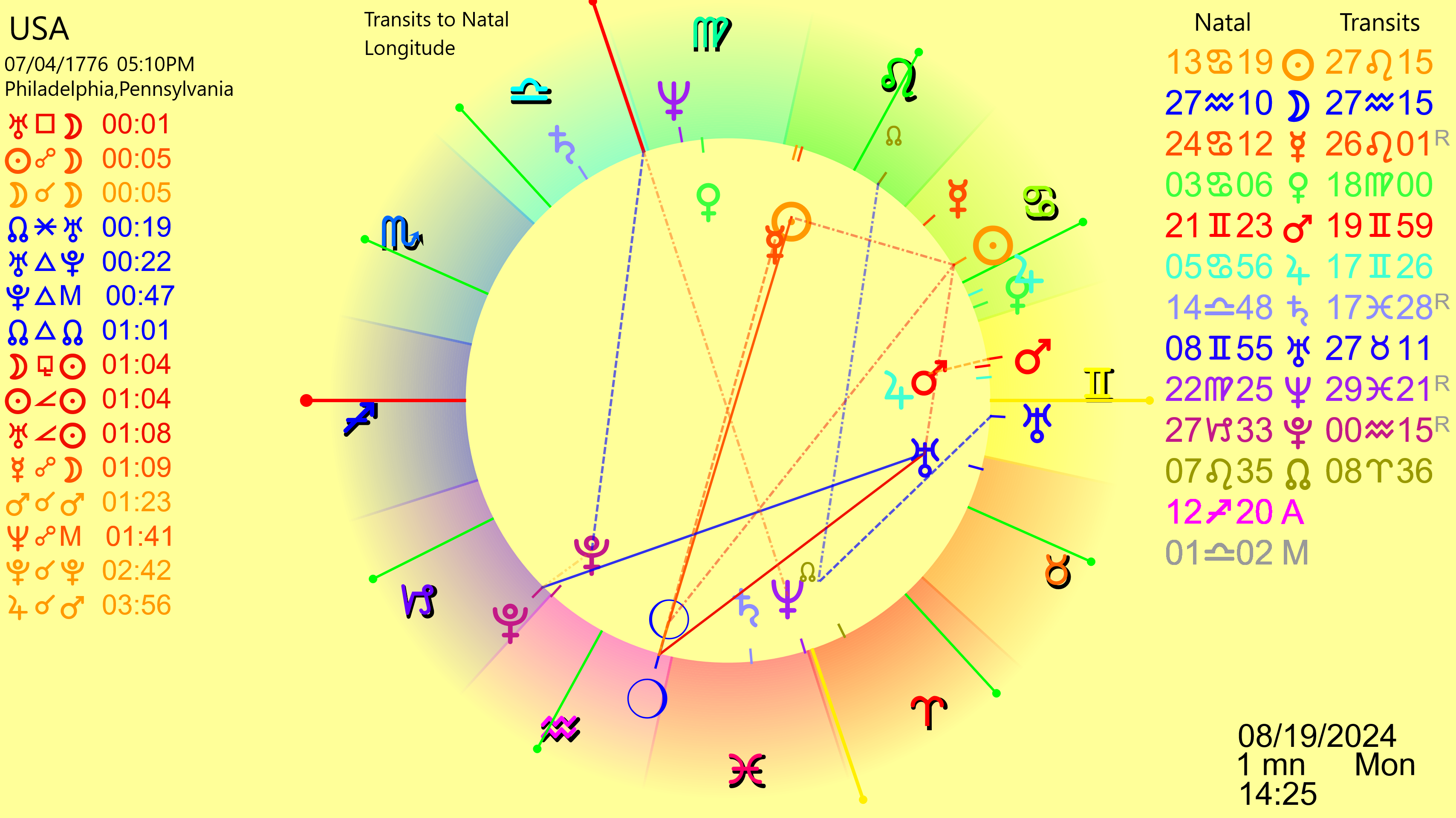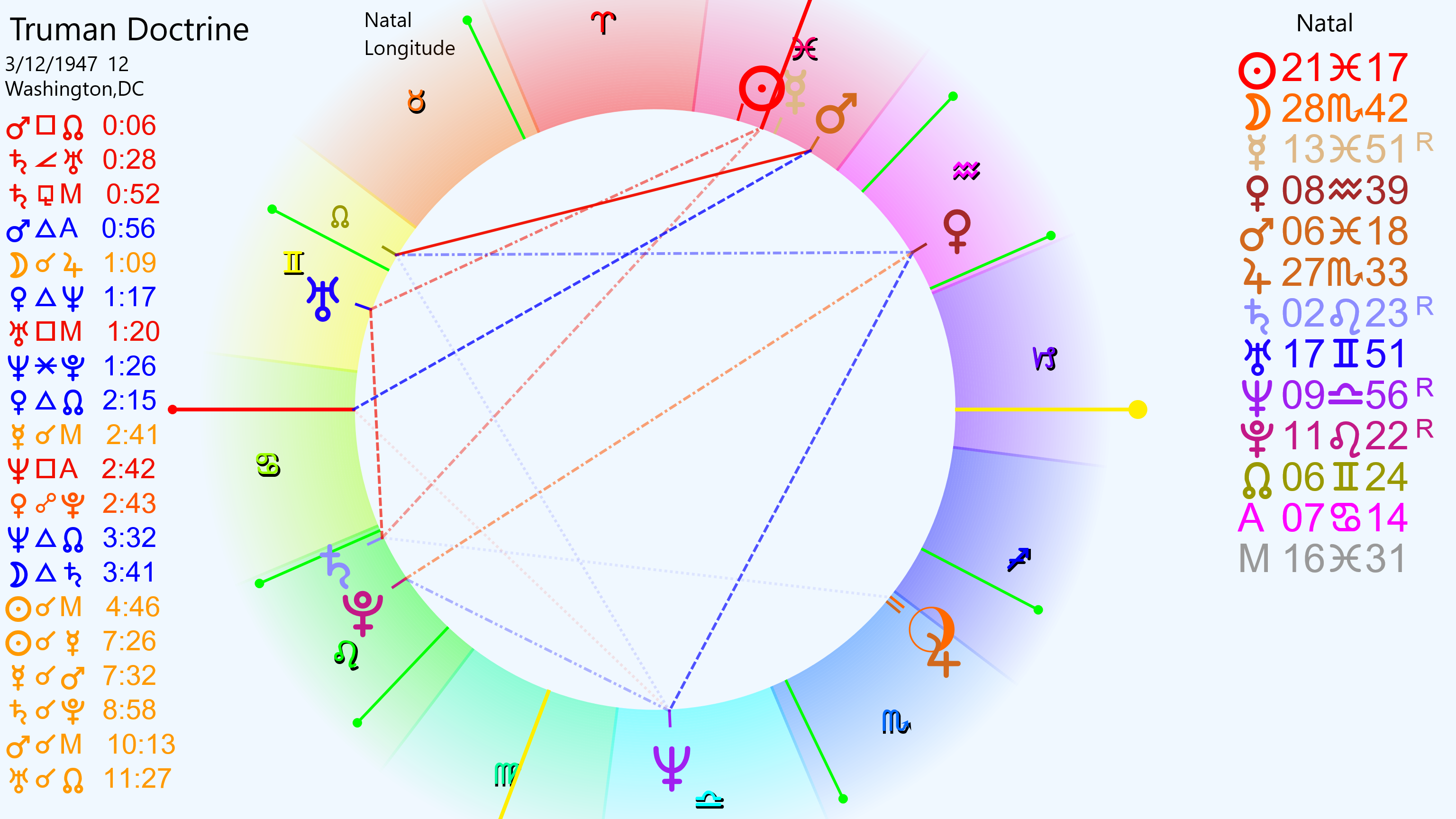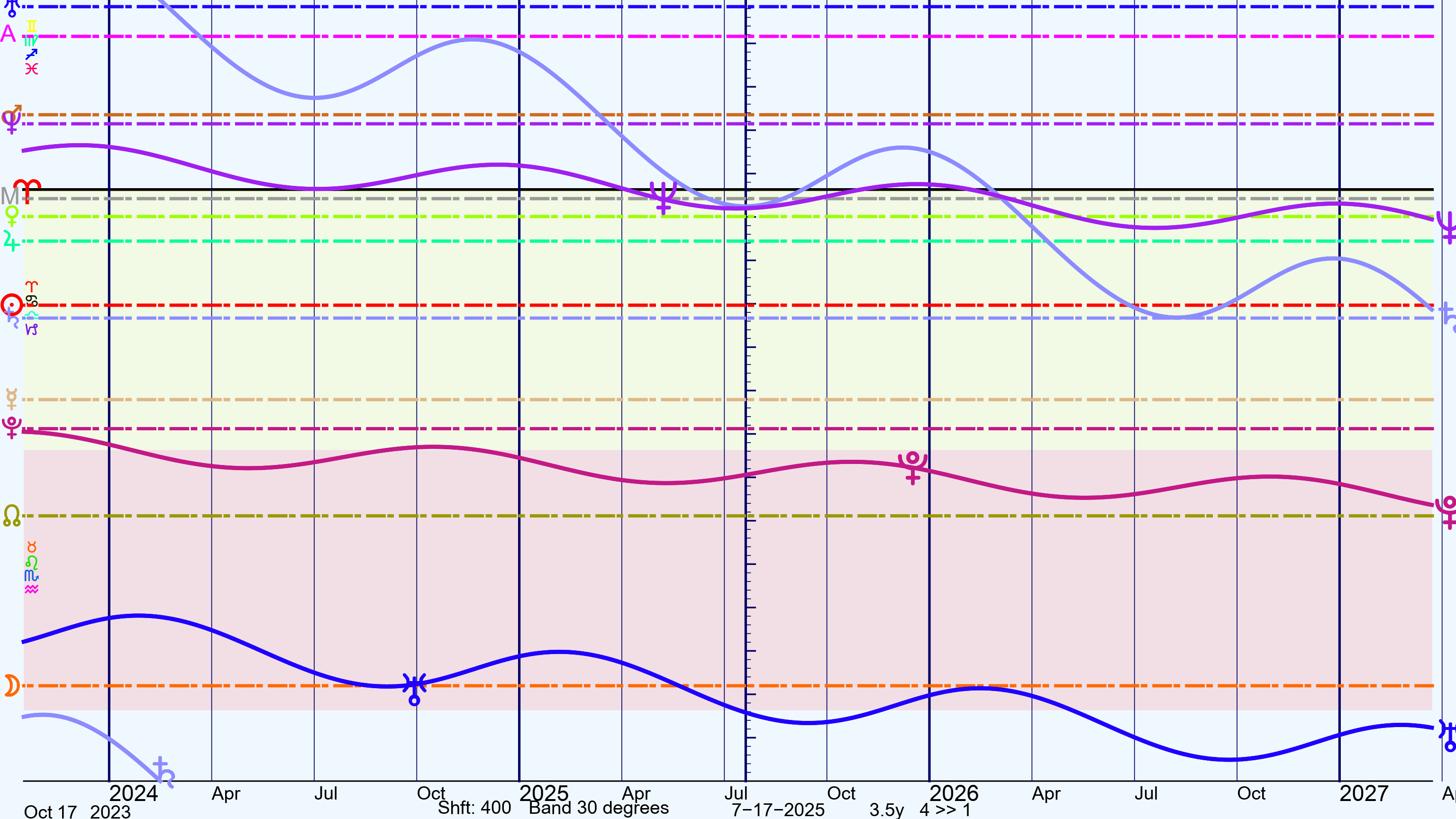 In this period Neptune is at the midpoint of those two other outer planets, and also at the Cardinal Axis. This symbolized the incredible amount of hype (also known as BS) currently in existence. For one example, examine the AI hype coming from a Company Near You. Everybody is crazy. Neptune is even more important in this period than usual and since it is on the Aries Point everyone feels it. Don’t believe anything. Though the idea has been widely criticize (more Neptune) you need to do your own research on everything. Don’t believe what the “experts” tell you.