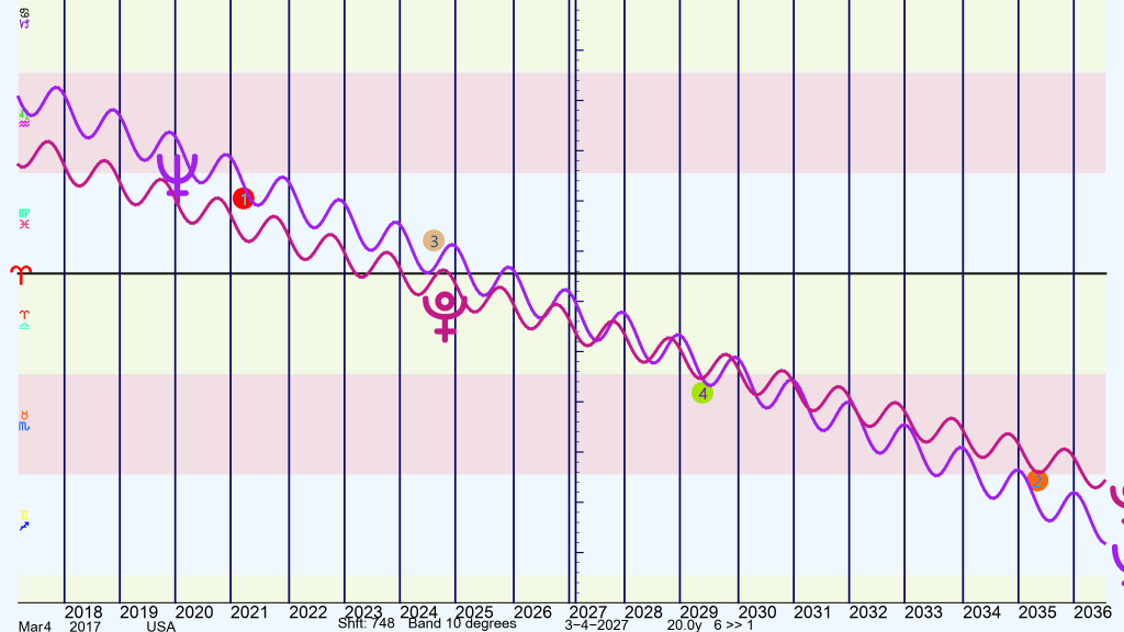 Currently we have Neptune at the Aries Point and at the midpoint of Pluto in Aquarius and Uranus in Gemini. This lasts, depending on the orb used, for all of the decade. All three planets have just entered or will soon enter positive signs. They also form two sextiles and a trine, forming a shape that resembles a teeter-totter (also known as a seesaw) with Pluto one on side and Uranus the other with the fulcrum as Neptune. As in a real life teeter-totter, this represents a conflict; in this case a conflict between a future symbolized by Pluto and one symbolized by Uranus. Neptune represents a force that can either go towards the Pluto side or towards the Uranus side. I’ve discussed before the symbolism I apply to both planets but I will illustrate them again here. The previous time Neptune was at the midpoint of Uranus and Pluto, and not in a Grand Trine, was the first decade of the Sixteenth Century. (When Pluto was in a Grand Trine with Uranus and Neptune, so that all three took turns at being at the midpoint of the other two, was during the Enlightenment — Eighteenth Century). That midpoint configuration in the 1500’s did not last as long as this one will. Now there are a lot more people on the planet than there were 500 years ago and things are moving a lot faster. So this time will see a very large change, bigger than most people expect.