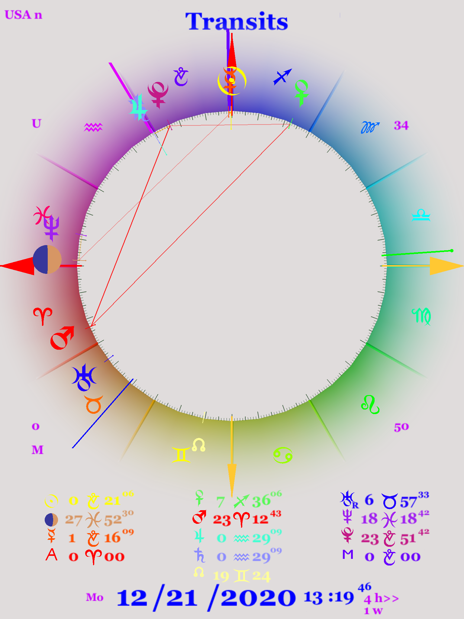 In this case the conjunction only happens once. This is followed by a conjunction of Jupiter and Pluto three times, followed by a single conjunction of Jupiter and Saturn at 0 Aquarius on the Winter Solstice. This new cycle of Saturn and Pluto, starting in 2020, corresponds to the Zeitgeist Change that I wrote about for several months. This will be a preview of all the changes coming our way. One can see that conjunction as the “opening gun” for the big changes to happen in the third decade of the Twenty-First Century. Since two other important cycles are also stating at about this time, the Jupiter-Pluto and the Jupiter Saturn conjunctions, change will be the hallmark. The Jupiter-Saturn cycle was discussed at length in post about Watershed Presidential elections and 2020 will see another Watershed Election. In the chart for the single Saturn-Pluto conjunction on January 12, 2020, we see that both the Sun and Mercury are conjoined Saturn and Pluto. This quadruple conjunction is also configured with the United States chart, as shown below. It is trine the US Saturn, opposite the US Mercury, and sesquiquadrate the US Uranus. So this Saturn-Pluto will definitely affect the US, in ways we can’t see yet. Not shown is the inconjunct (quincunx – aspect of 150 degrees – separation or adjustment) between the multiple conjunction and natal Mars, suggesting the military and war will be involved. Also emphasizing this fact is that the antiscia (reflection over the Cancer/Capricorn axis) transiting Mars is on that super conjunction.